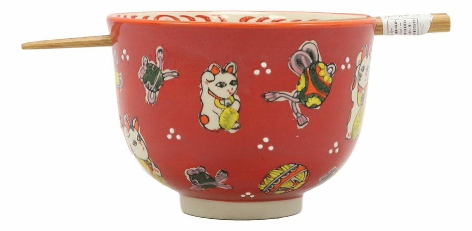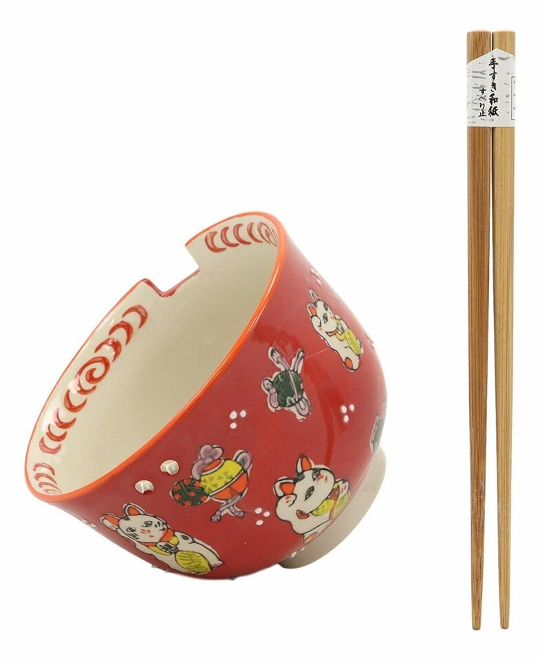 Ebros Lucky Cat Japanese Maneki Neko Red Porcelain Ramen Soup Bowl With Chopsticks Set