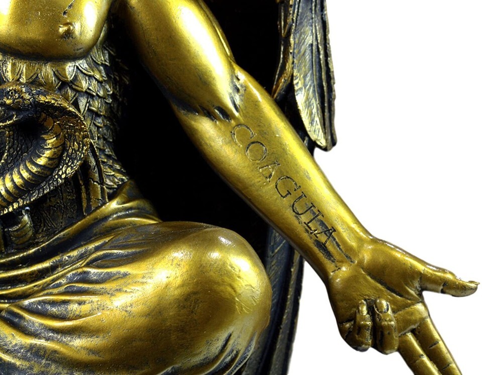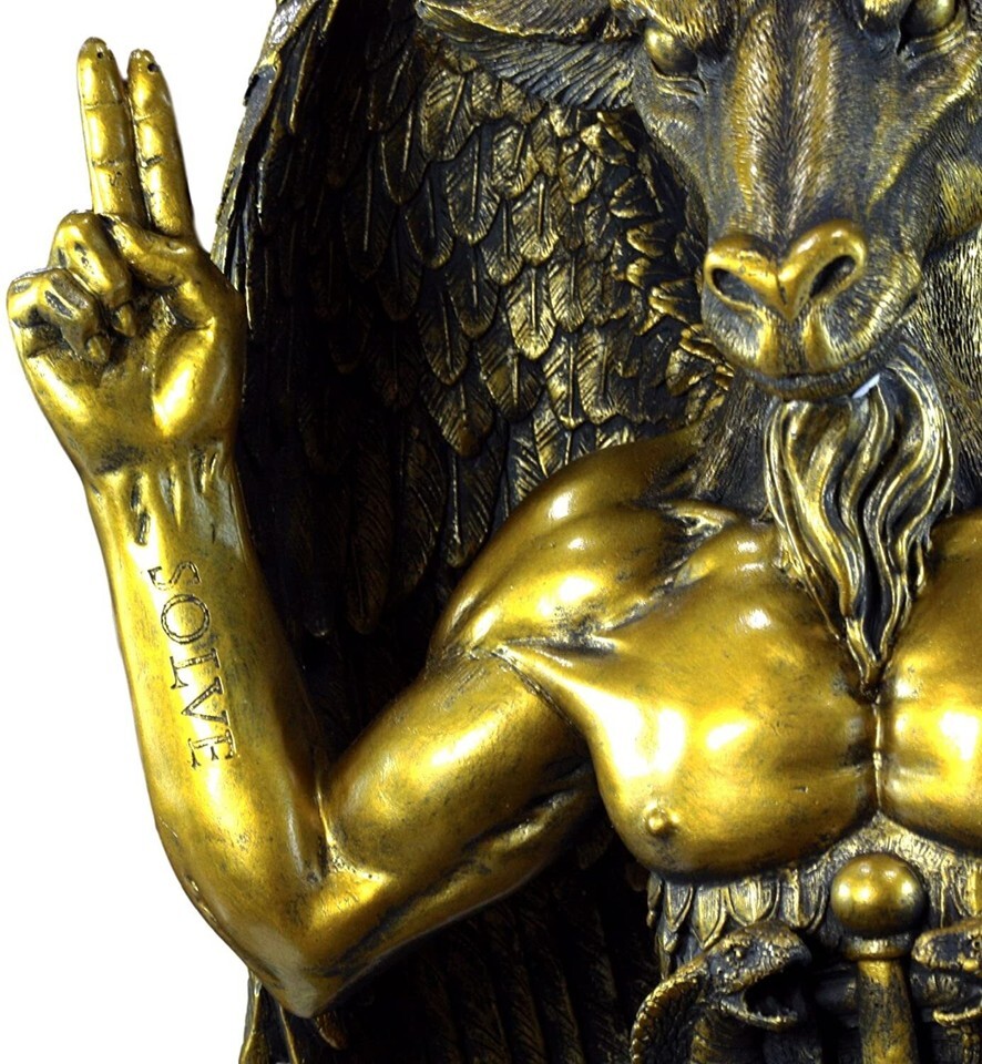 ? Baphomet contains binary elements symbolizing a reconciliation of opposites, emblematic of the willingness to embrace, and even celebrate differences across individuals. This Baphomet statue boasts of immaculate details from the throne of Earth's Geographical Globe the statue rests on, the writings of Solve Et Coagula carved onto the hands, intricate details of the angelic wings and many other features that complete this statue. This Baphomet statue is sculpted in oversized proportions.