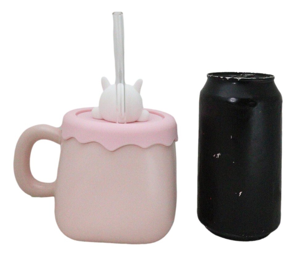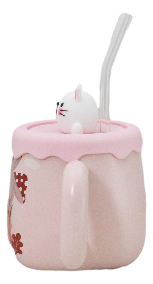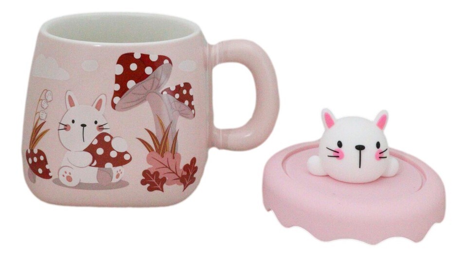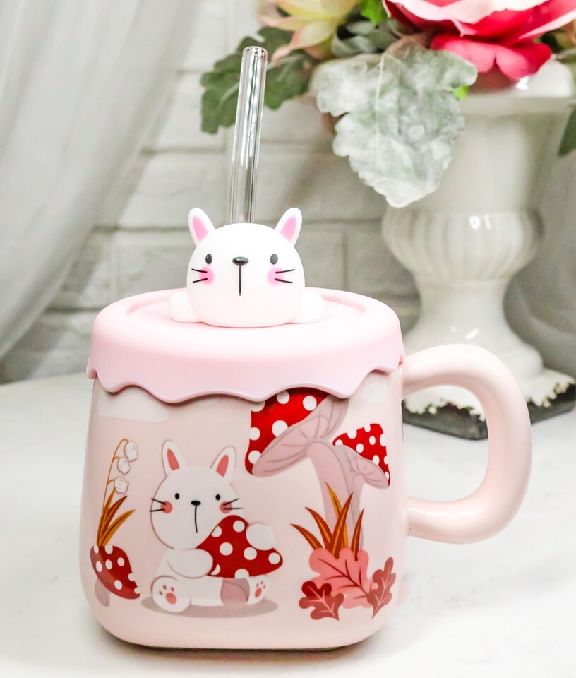 Bunny Rabbit Toadstool Mushrooms Pink Ceramic Mug With Silicone Lid And Straw