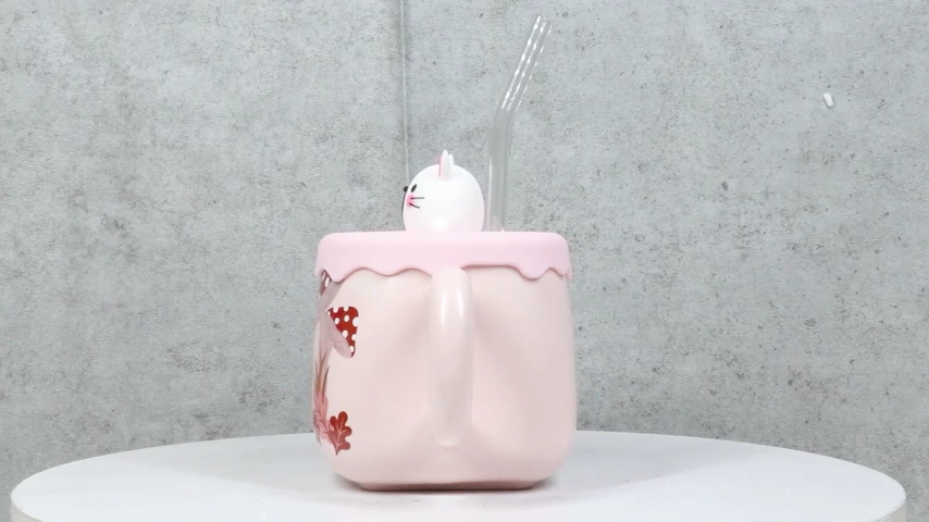 ? Start your day with a smile with our Whimsical Rabbit Ceramic Mug Cup, equipped with a silicone lid cover and reusable straw. This delightful mug is crafted from high-quality ceramic, showcasing a rabbit playing in a whimsical toadstool mushrooms forest. This gorgeous pastel pink colored mug is the perfect companion for your favorite beverages.