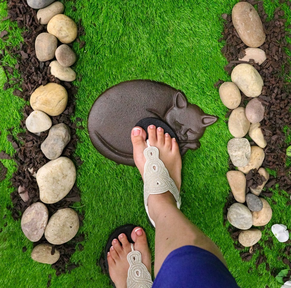 ? This sleeping cat stepping stone is made of cast iron, hand painted and polished individually.