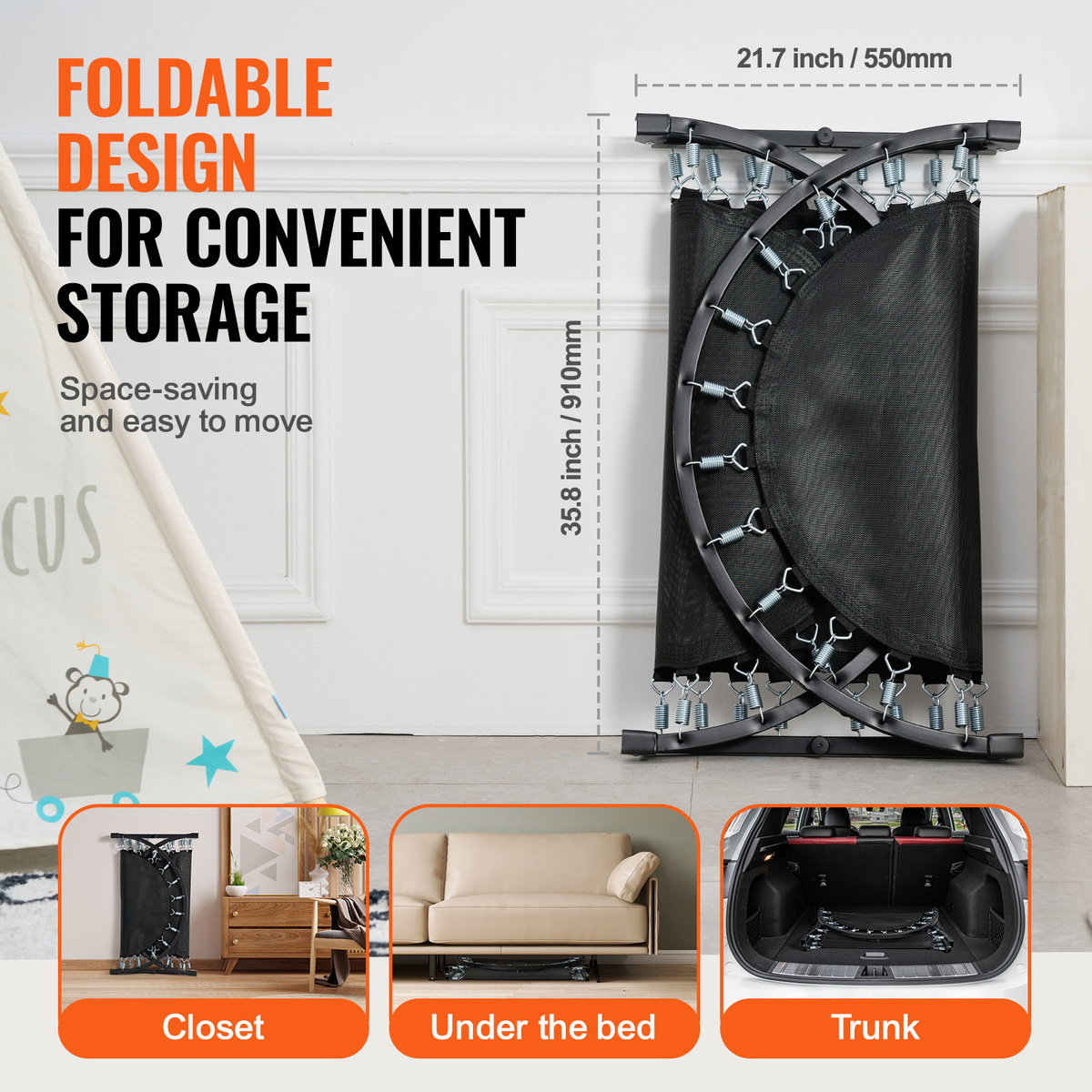 Quick Storage with Foldable Design: Featuring a foldable frame design,our mini baby toddler trampoline occupies only one-third of its original volume when folded, making storage easy and space-saving. It can be tucked away under a sofa or in the trunk of a car. The foldable design also makes it easy to move, allowing kids to jump wherever they like.