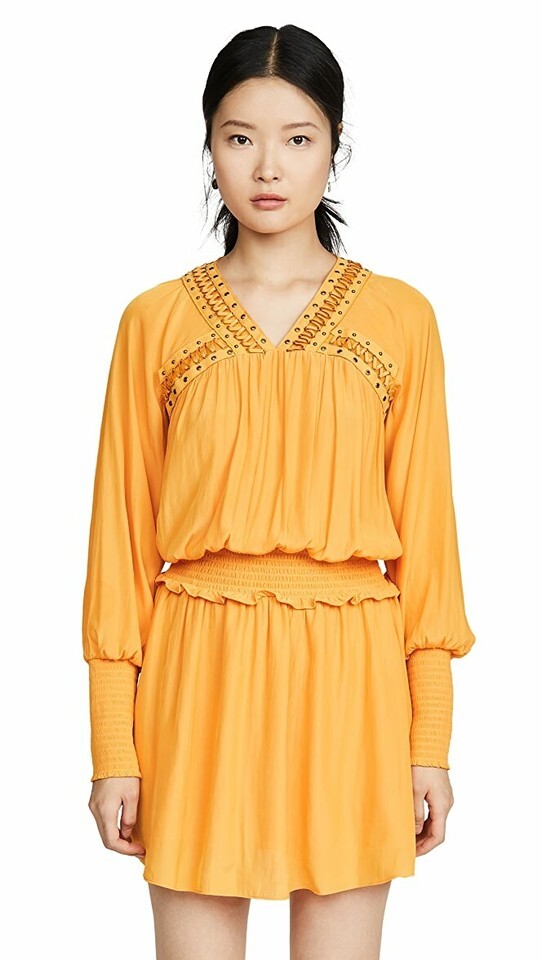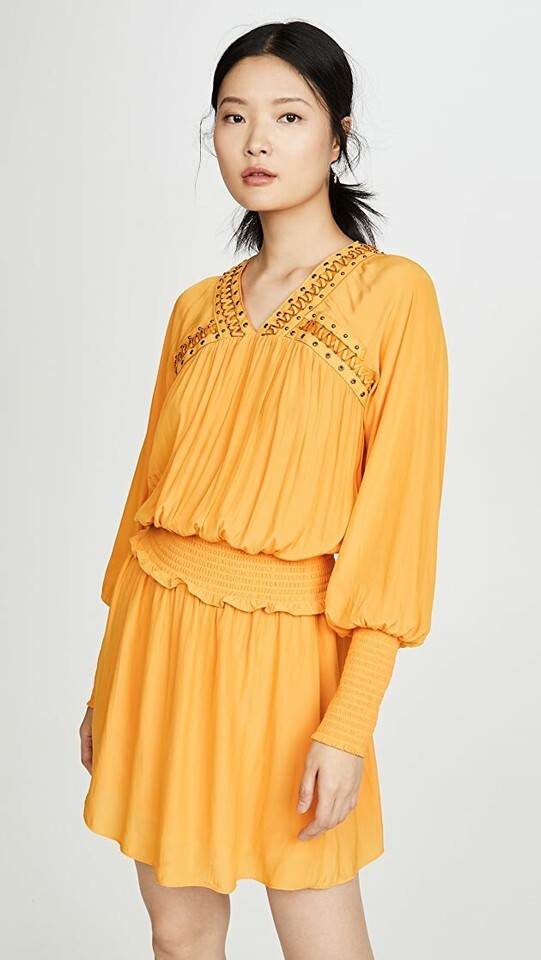 This is a great Ramy Brook dress. The Kelley dress in Buttercup yellow. Shirred waist and sleeves and laced detail around the neckline.