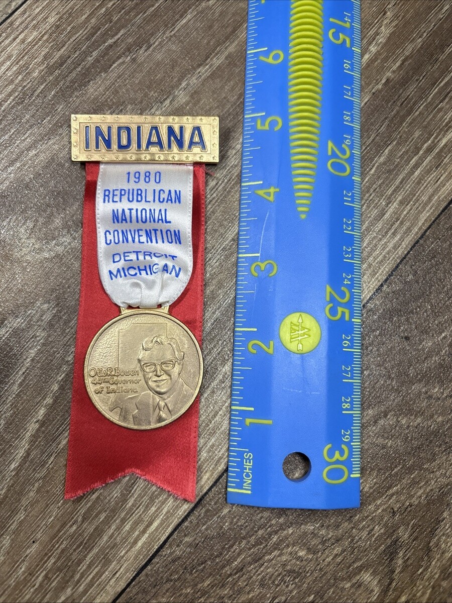 The product is a 1980 delegate ribbon/pendant from the Indiana Republican National Convention featuring Governor Otis Bowen on the pendant. This collectible item represents a piece of historical memorabilia from a political event in the United States, specifically the Republican Party. The ribbon/pendant likely holds sentimental value for collectors interested in political memorabilia, particularly from the 1980s Republican National Convention. This artifact offers a tangible connection to a significant moment in American political history.