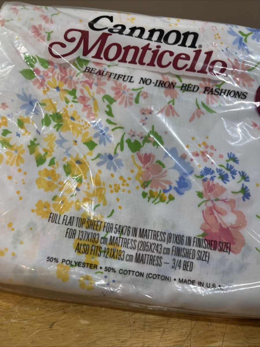 This vintage Cannon Monticello floral print full flat sheet features a charming cottagecore design with delicate white flowers on a double-sized bed. Made from a blend of polyester and cotton, this flat sheet is perfect for adding a touch of vintage style to any bedroom. With a length of 81 inches and a width of 54 inches, this sheet is easy to care for with machine wash warm instructions. The set includes a fitted sheet, making it a practical and stylish choice for any home.