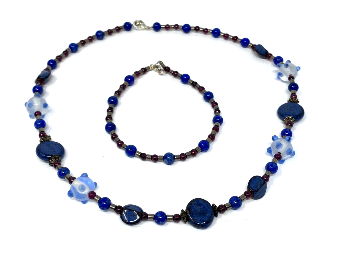 Artisan Made Beaded Necklace & Matching Bracelet Blue/Burgundy/White