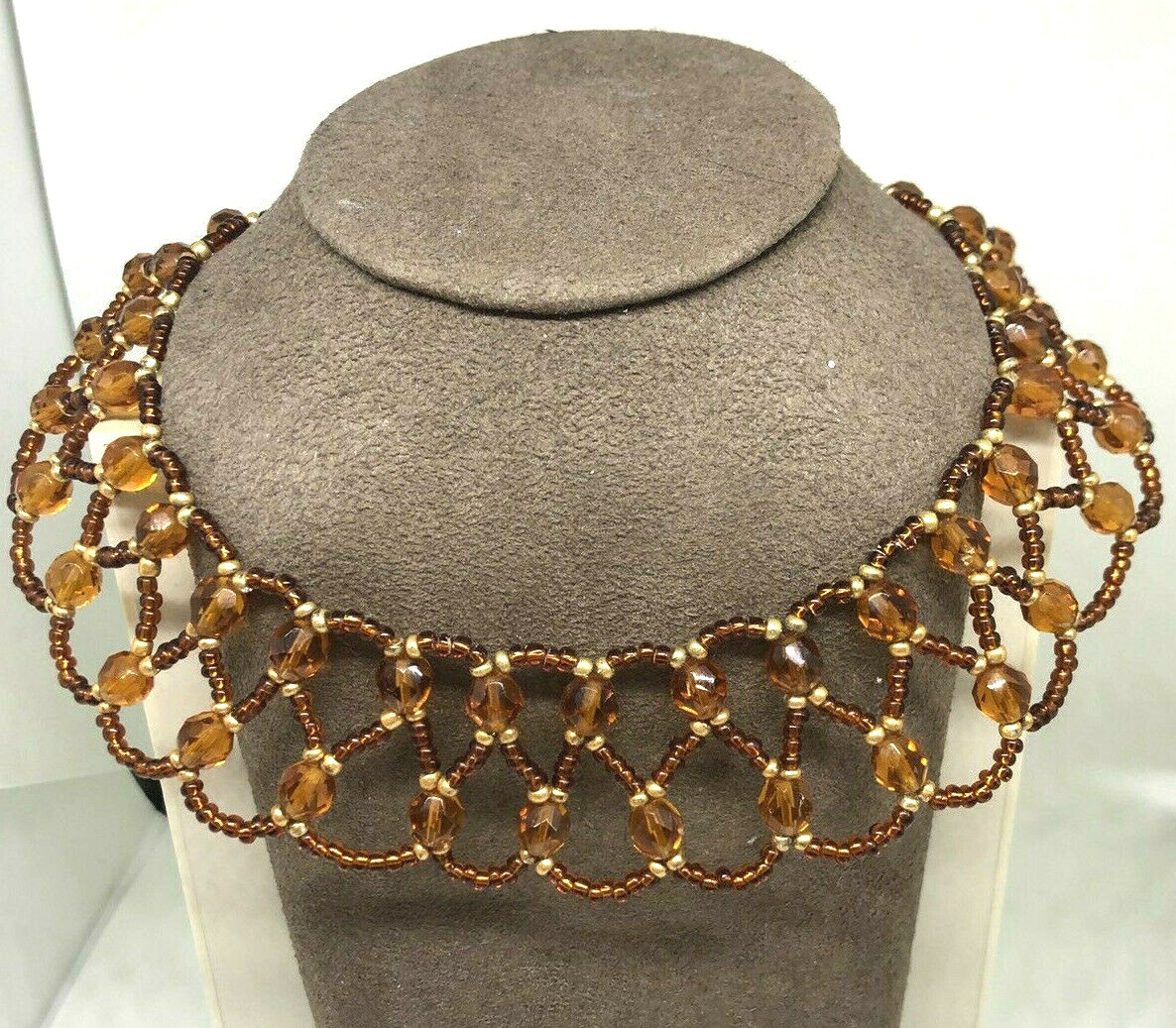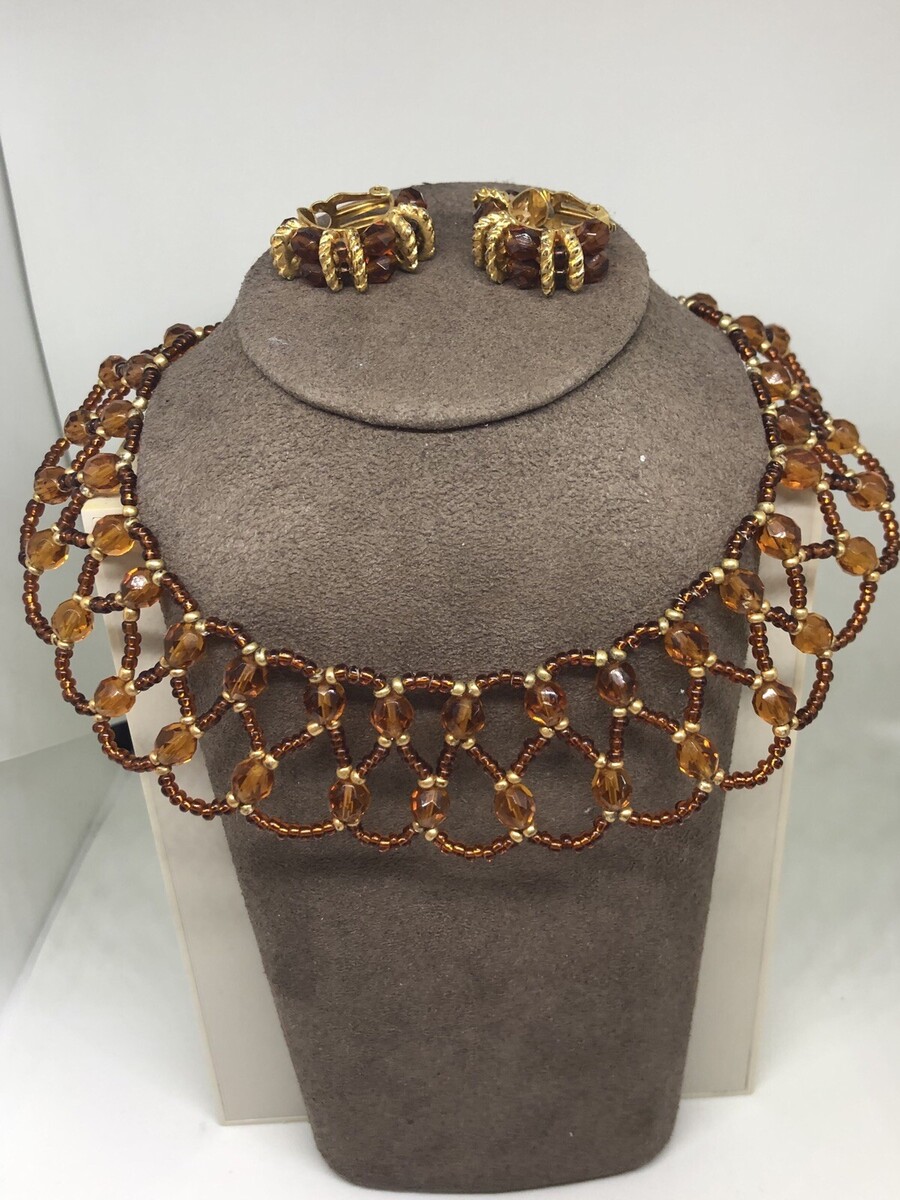 Vintage Hand Beaded Collar Necklace and Clip Earrings, Amber/Gold