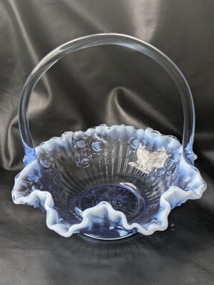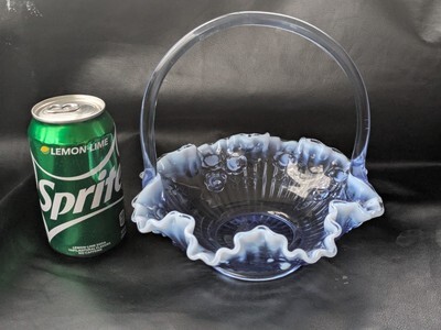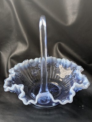 Fenton Glass Bride Basket Raffled Lavender Blue Opalescent Cabbage Rose 7.5 Inch