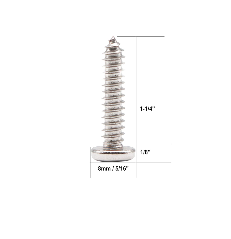[ ? ] Head Diameter: 8mm; [ ? ] Thread Diameter: M4.8mm / 0.19" / #8; [ ? ] Thread Length: 1-1/4"; [ ? ] Head Height: 1/8";