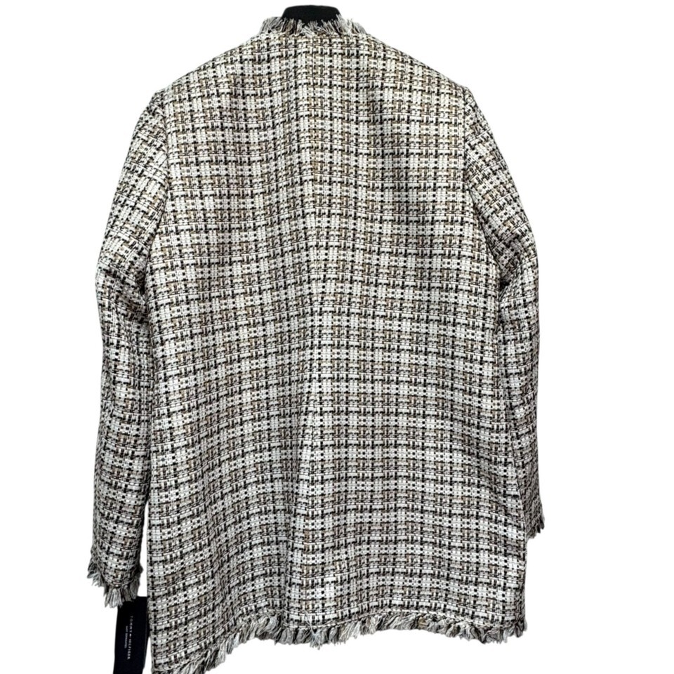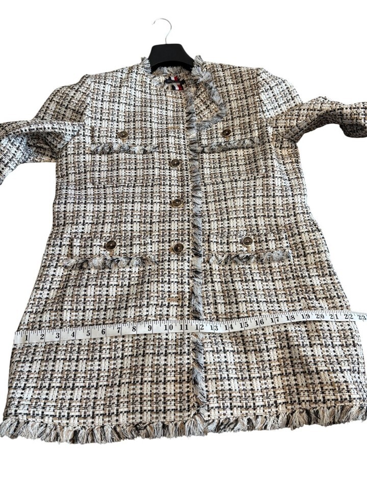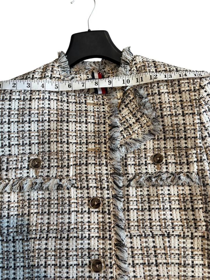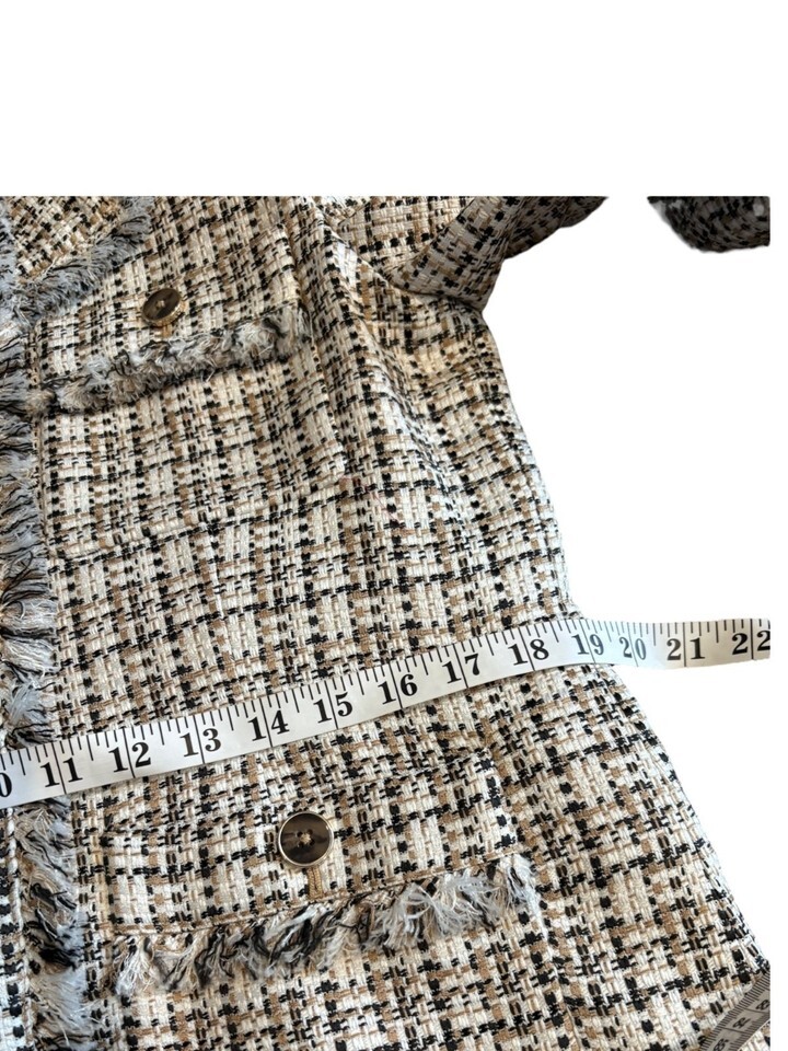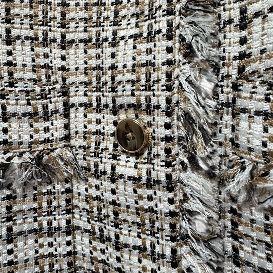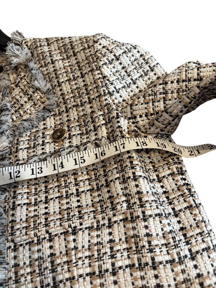 Chic and sophisticated tweed blazer featuring a tailored fit and elegant fringed trim. Ideal for adding a touch of class to any wardrobe.