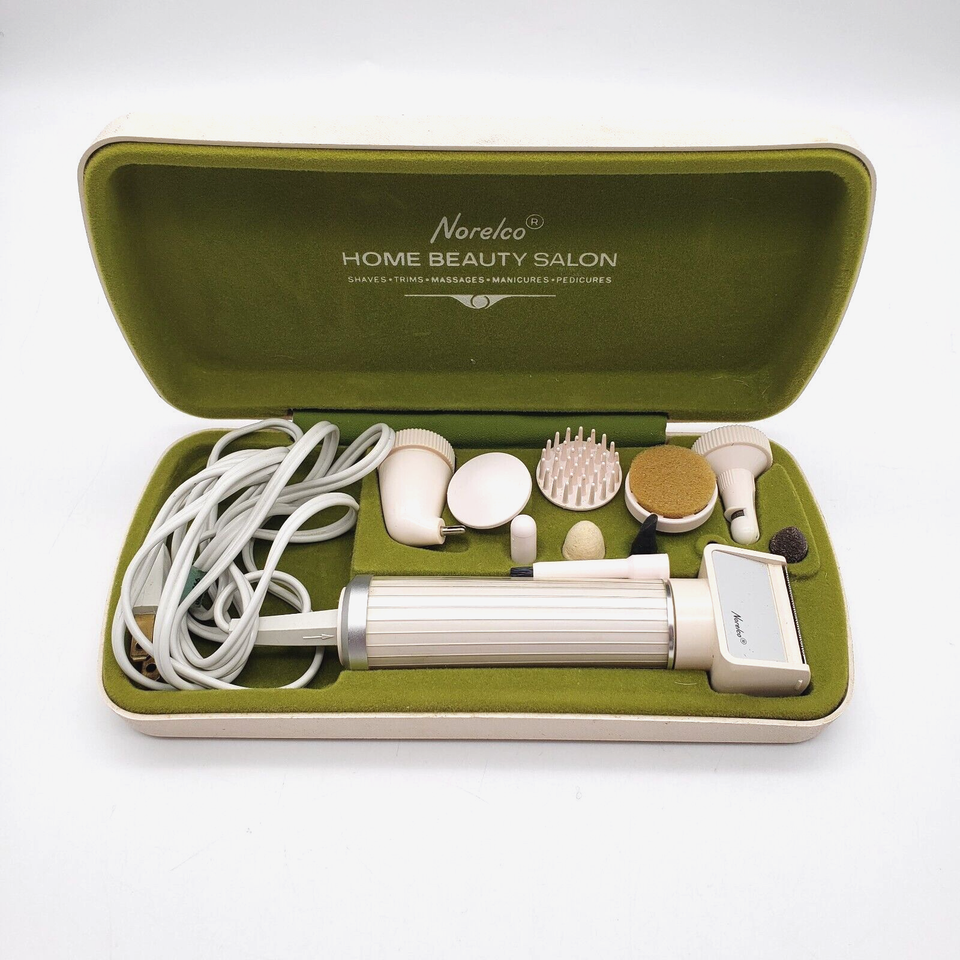 Vtg NORELCO Home Beauty Salon Kit Shaves, Trims & Mani Pedis (w/ 9 Attachments)