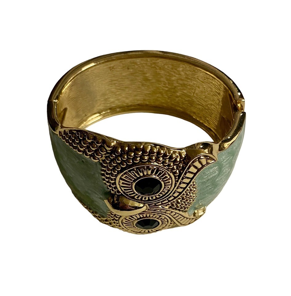 Owl Cuff Bracelet Large Statement Enamel Mint Green Hinged Gold Toned