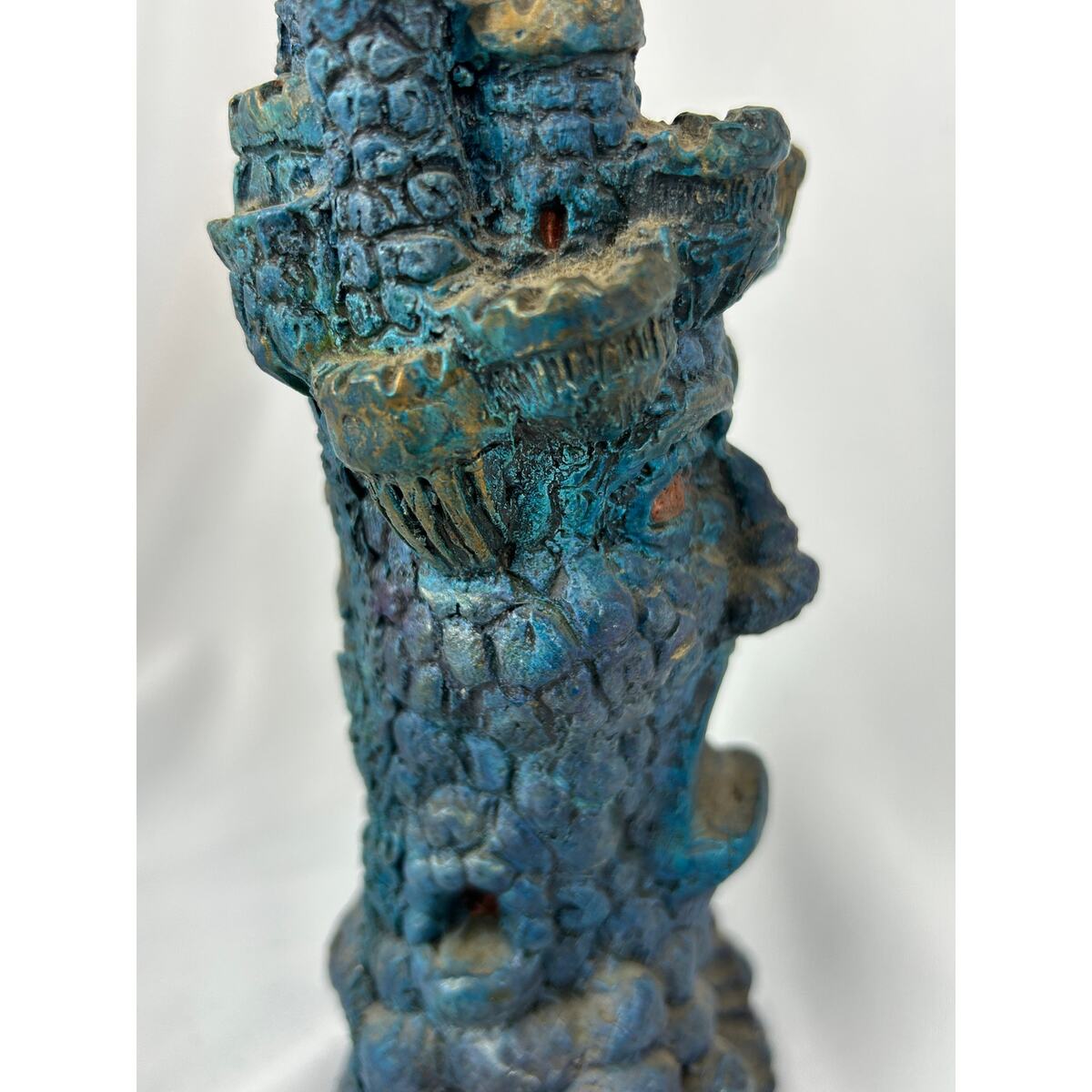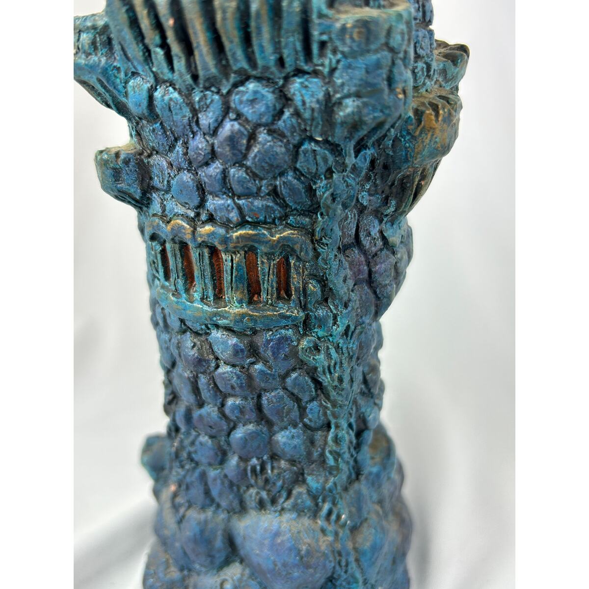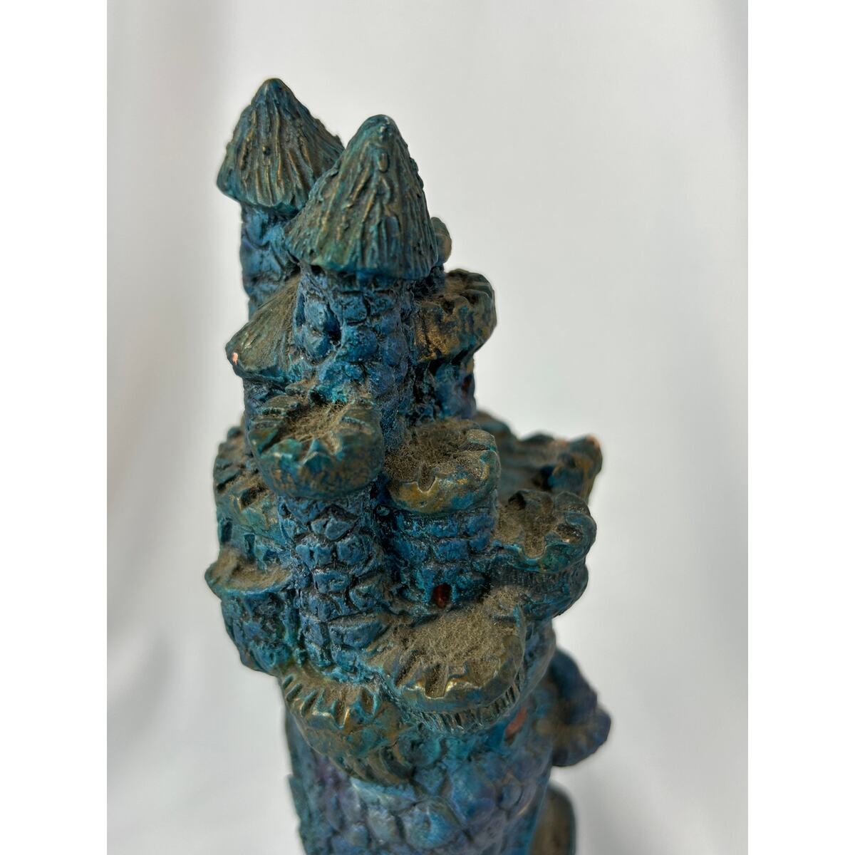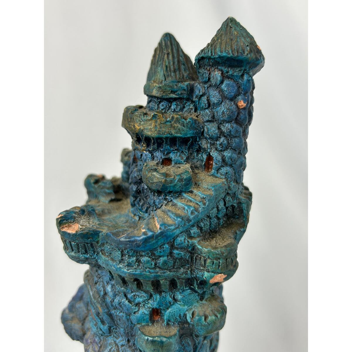 A striking hand-sculpted fantasy tower by Mike Makras, signed and dated 1984. This imaginative work rises in stacked terraces and weathered stone, its carved face emerging from the cliffside beneath a winding stair that leads upward toward clustered turrets. The surface is richly textured, evoking the feel of an ancient stronghold shaped by time and legend. Areas of paint wear and softening are present throughout, typical of Makras? early hand-modeled pieces, yet the sculpture remains structurally sound and visually commanding. Standing just under ten inches tall, it captures the artist?s distinctive blend of mythic architecture and expressive form, making it a compelling addition for collectors of unique fantasy sculpture.