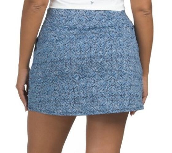 This Skort runs a little slimmer and a little shorter than most Golf skorts at 16" but can be worn for Golf, Tennis Pickleball. It is a Straight skort with a slight Aline shape for Movement. I also have this skort in several other colors such as the AZURE LAGOON Print, Solid Black, Solid Navy Blue Solid White.