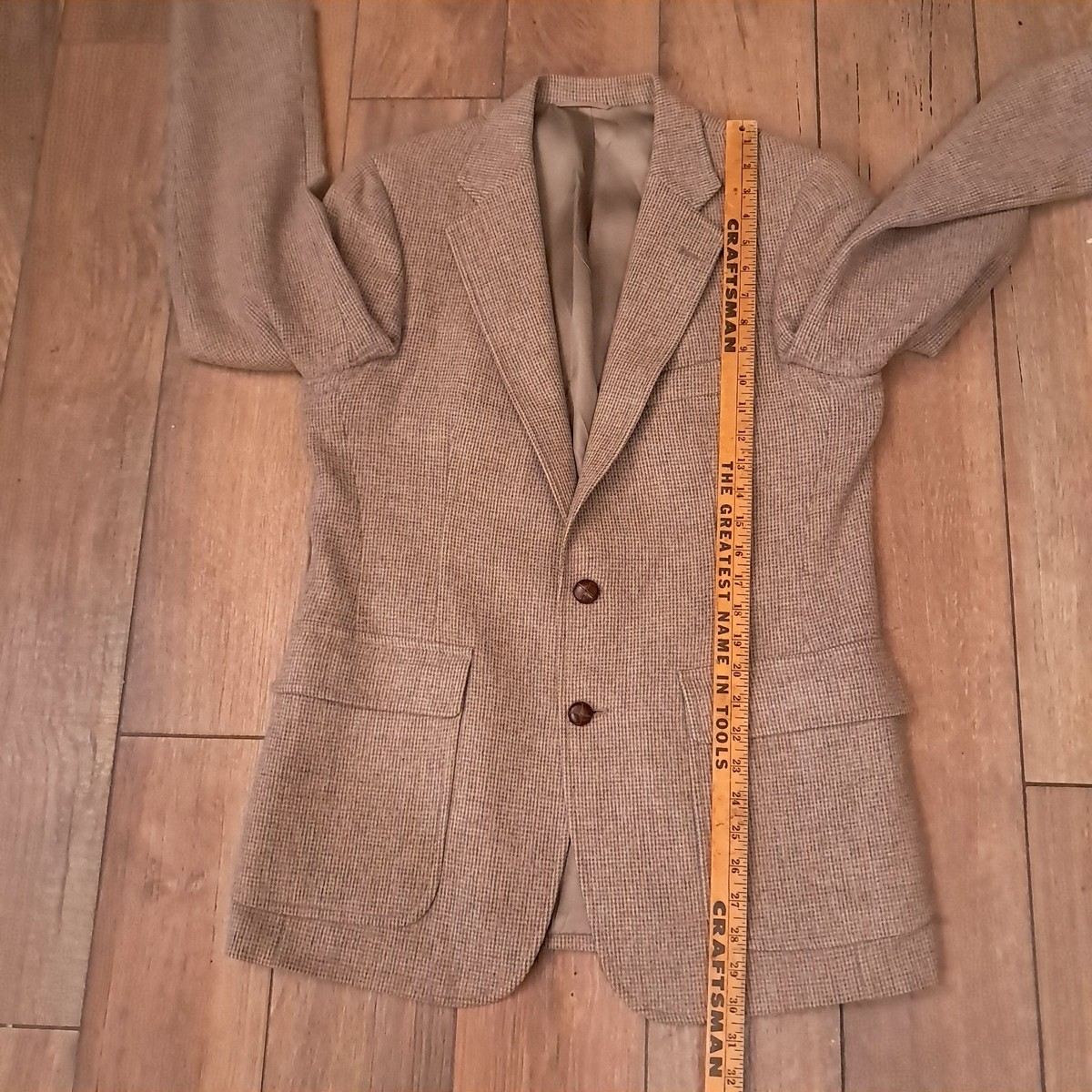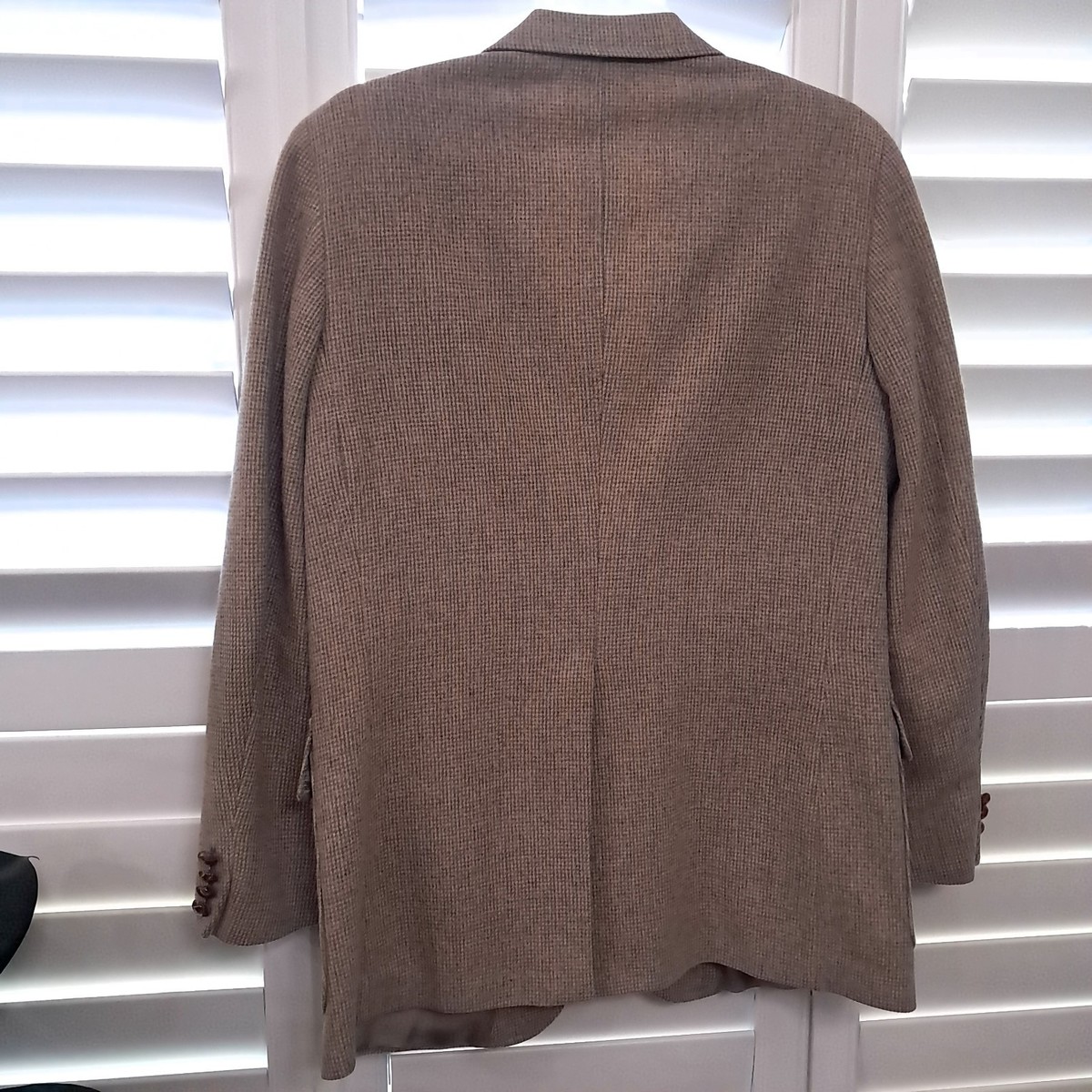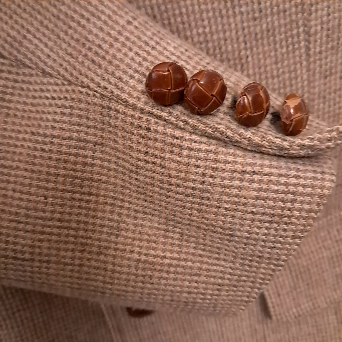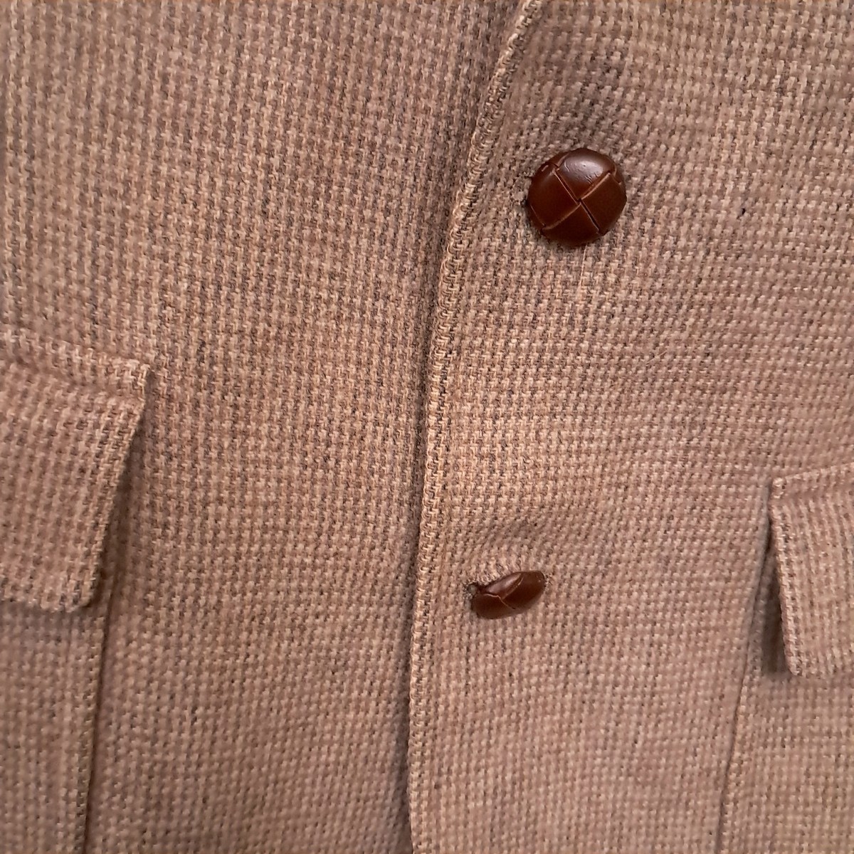 No size tag, but measures approximately size 40. Light tan with pattern. Brown leather buttons(have some wear) Slight wear under the arm pit and small tear on inside breast pocket. See pics for details including measurements.