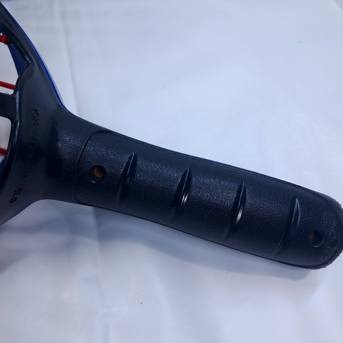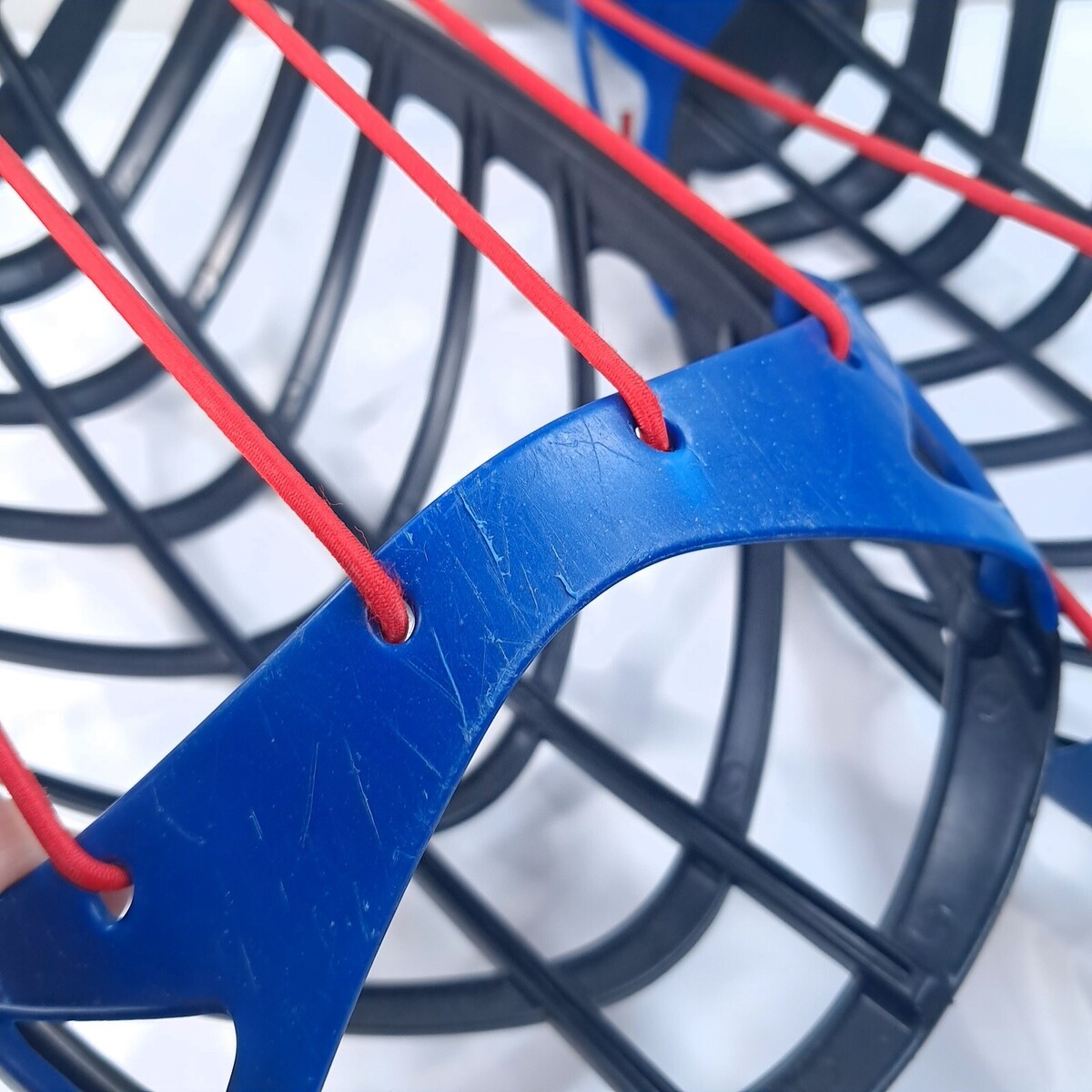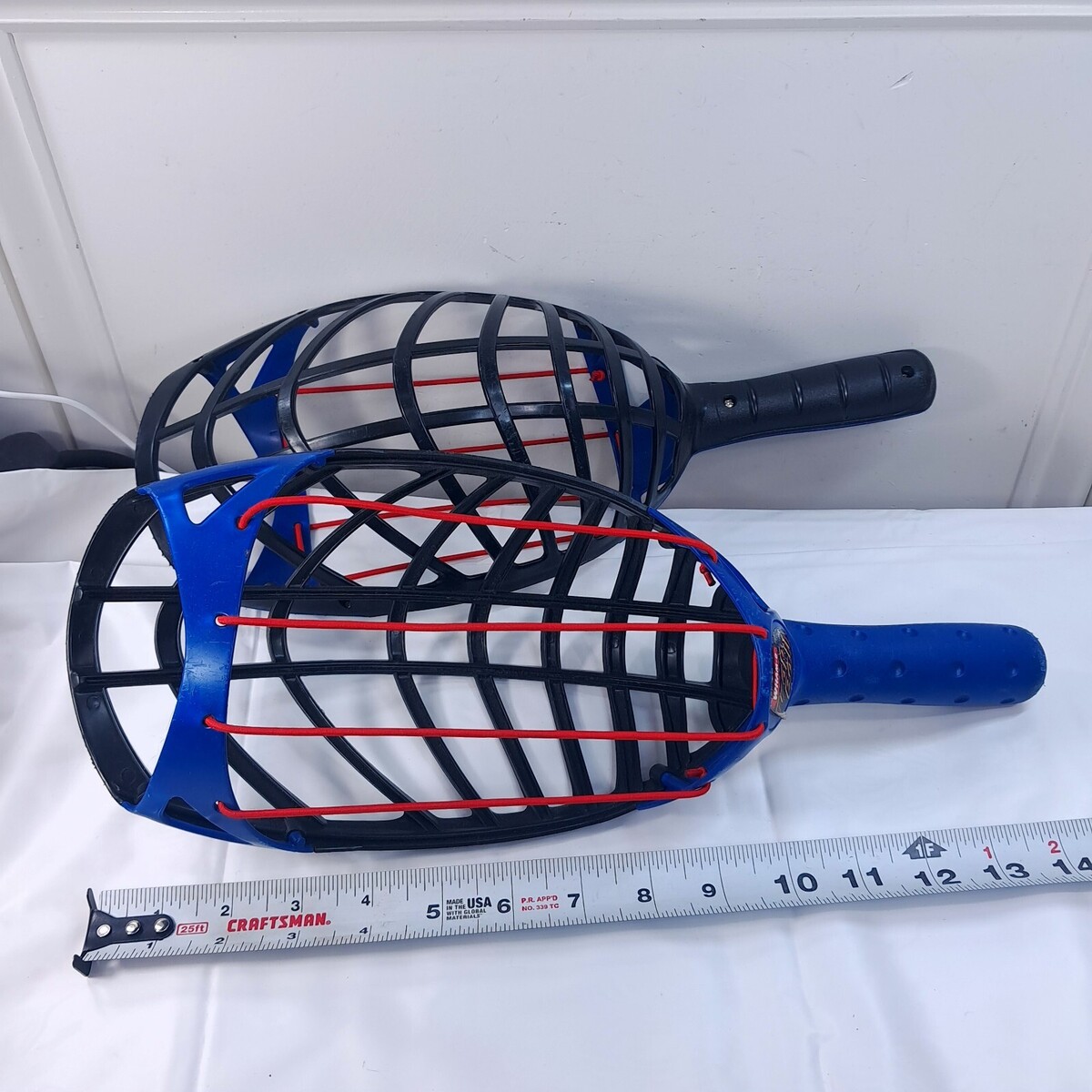 Includes 2 catching racquets in blue and black. Has bungie style cords to catch the ball in the racquet. Scratches/rust to screws/wear/sticker peeling/wear from play as shown.