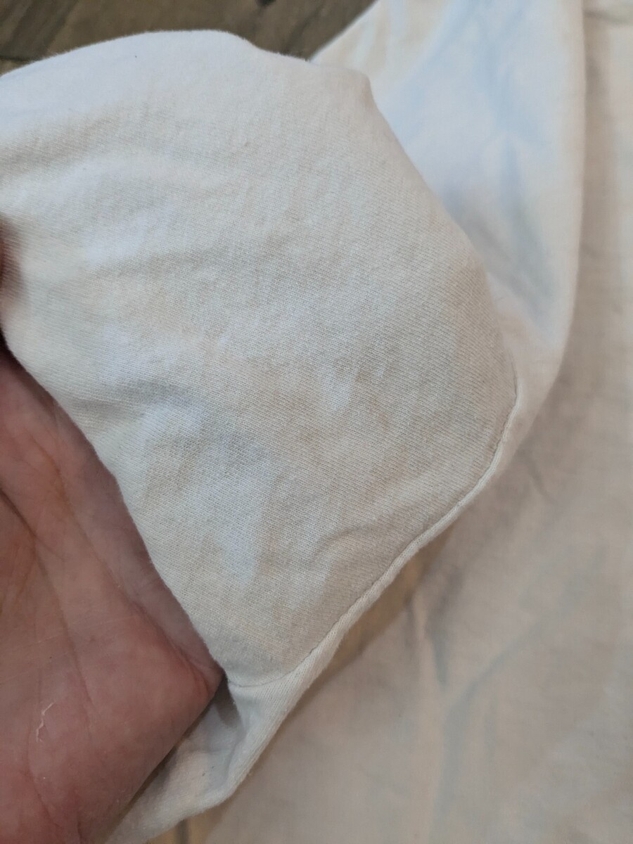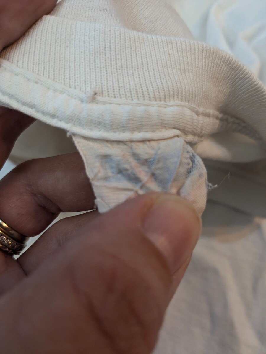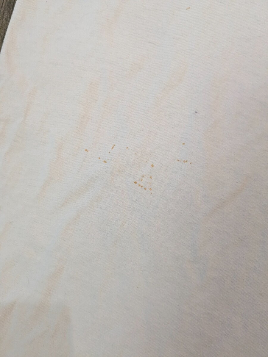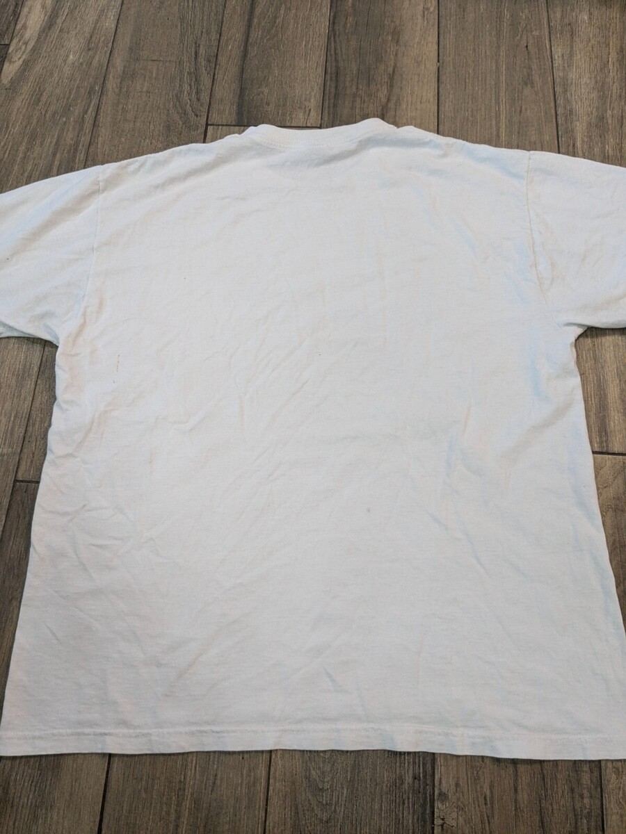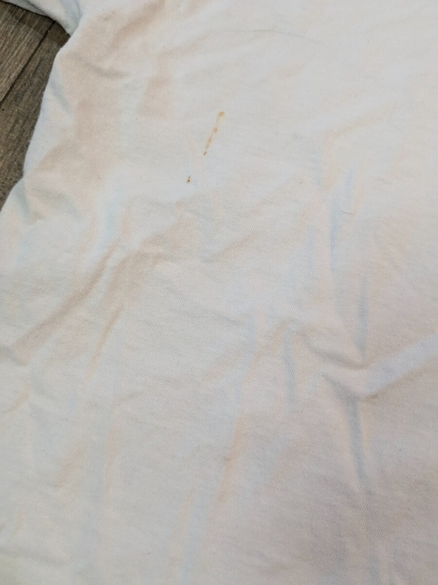 Stains, marks/discolorations as shown. Graphic is faded. Size is unreadable, so please see pics for measurements.