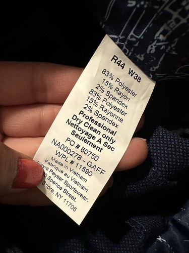Jacket: polyester/rayon/spandex; pants: polyester