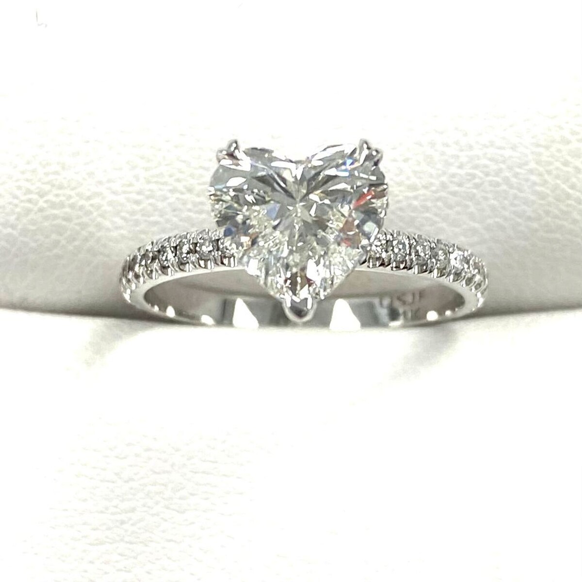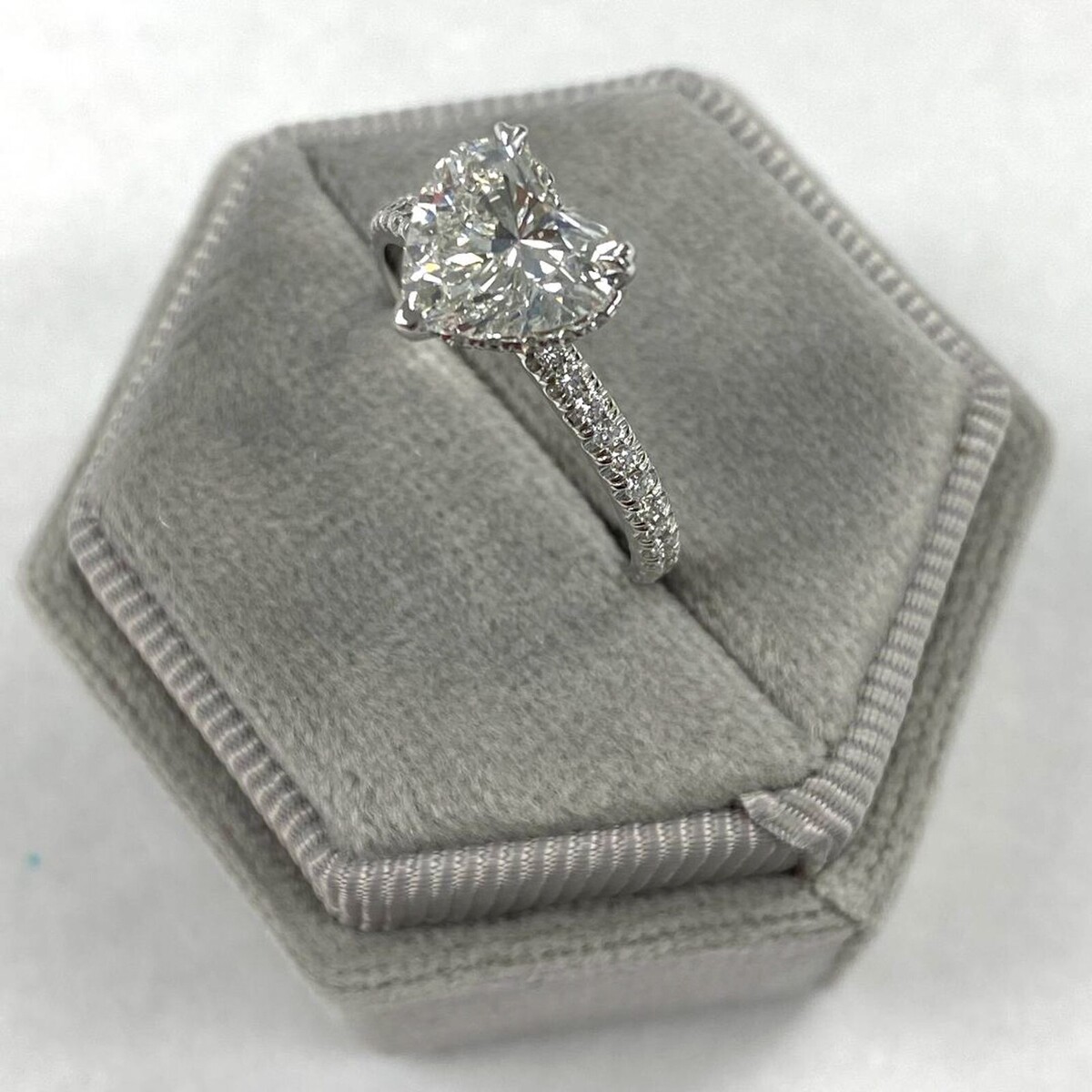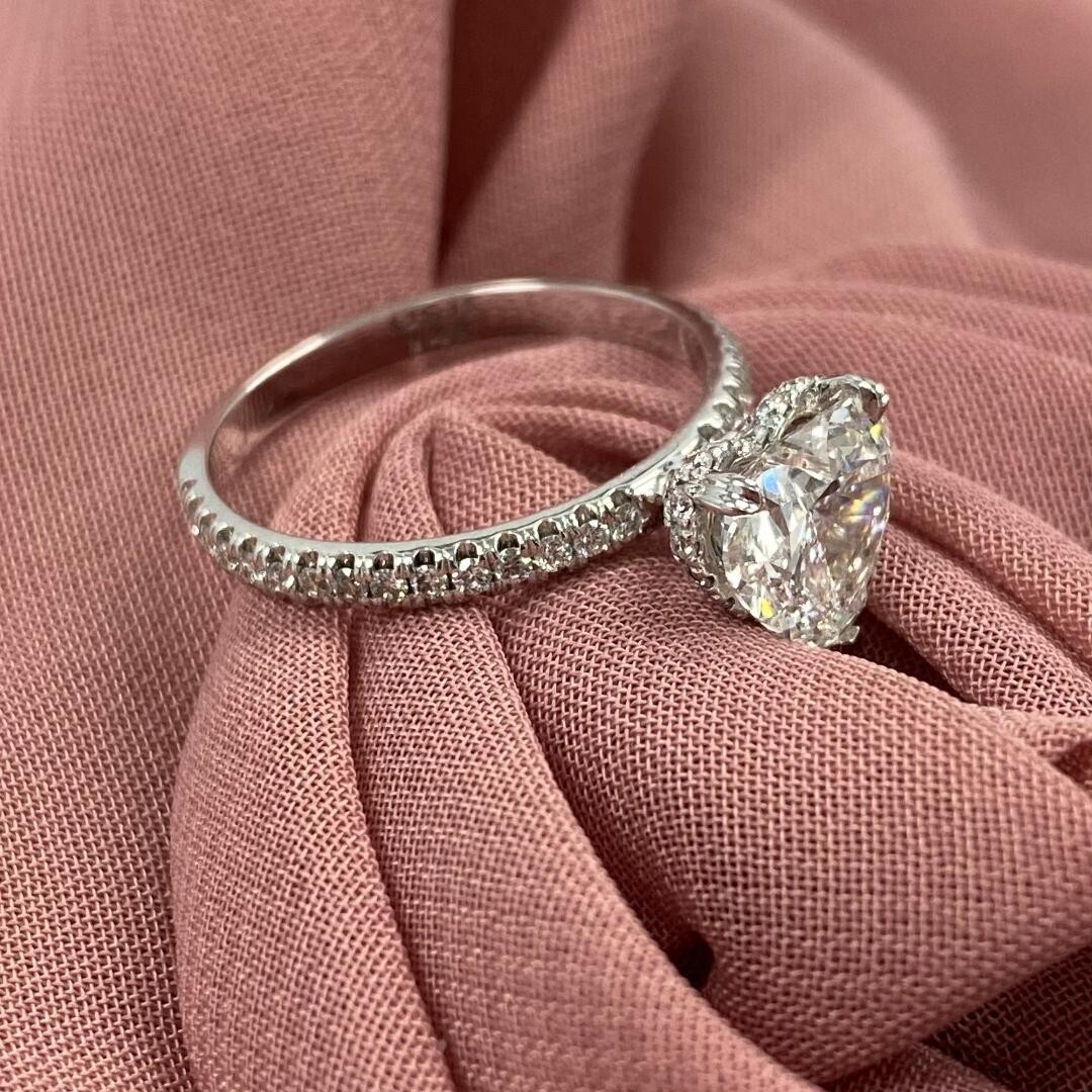 Das 1,59-Karat-Herz-Labor-Labor-Diamant wird fachmannisch geschnitten, um seine Brillanz und sparkle zu maximieren, und sitzt stolz auf einer Gruppe glanzender 14K-Weißgold. Das versteckte Halo-Design umgibt den herzformigen Diamanten mit einer atemberaubenden Reihe von zusatzlichen, brillanten, geschnittenen Labor-Diamanten und fügt noch mehr sparkle und Glanz hinzu.