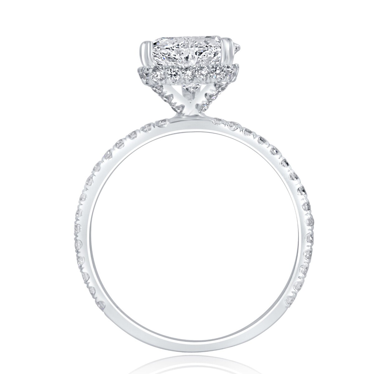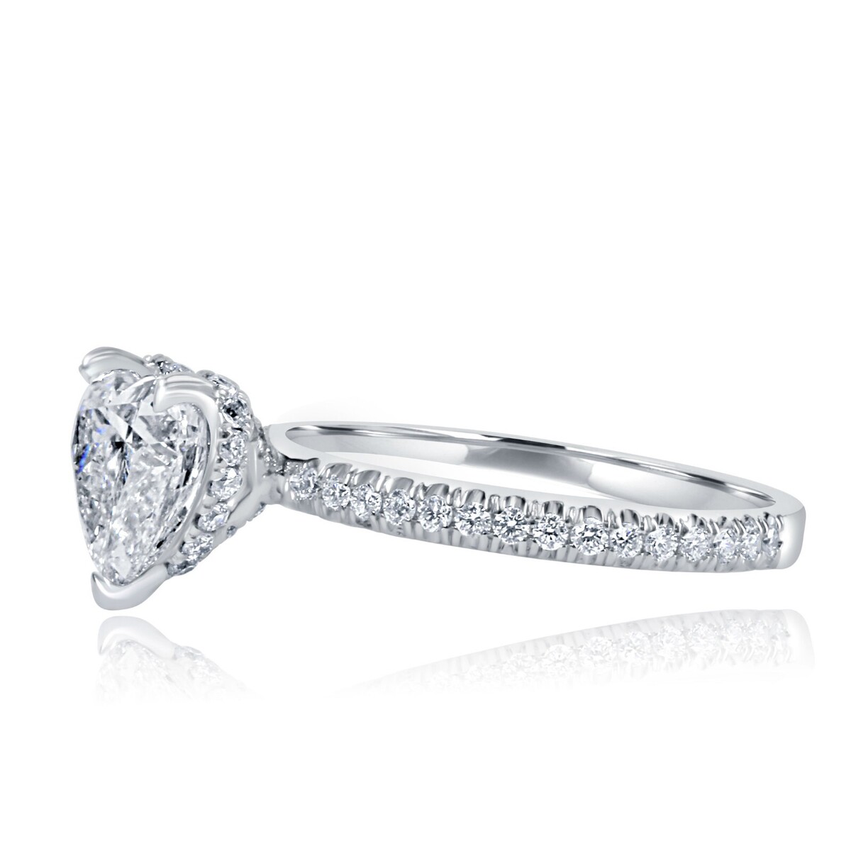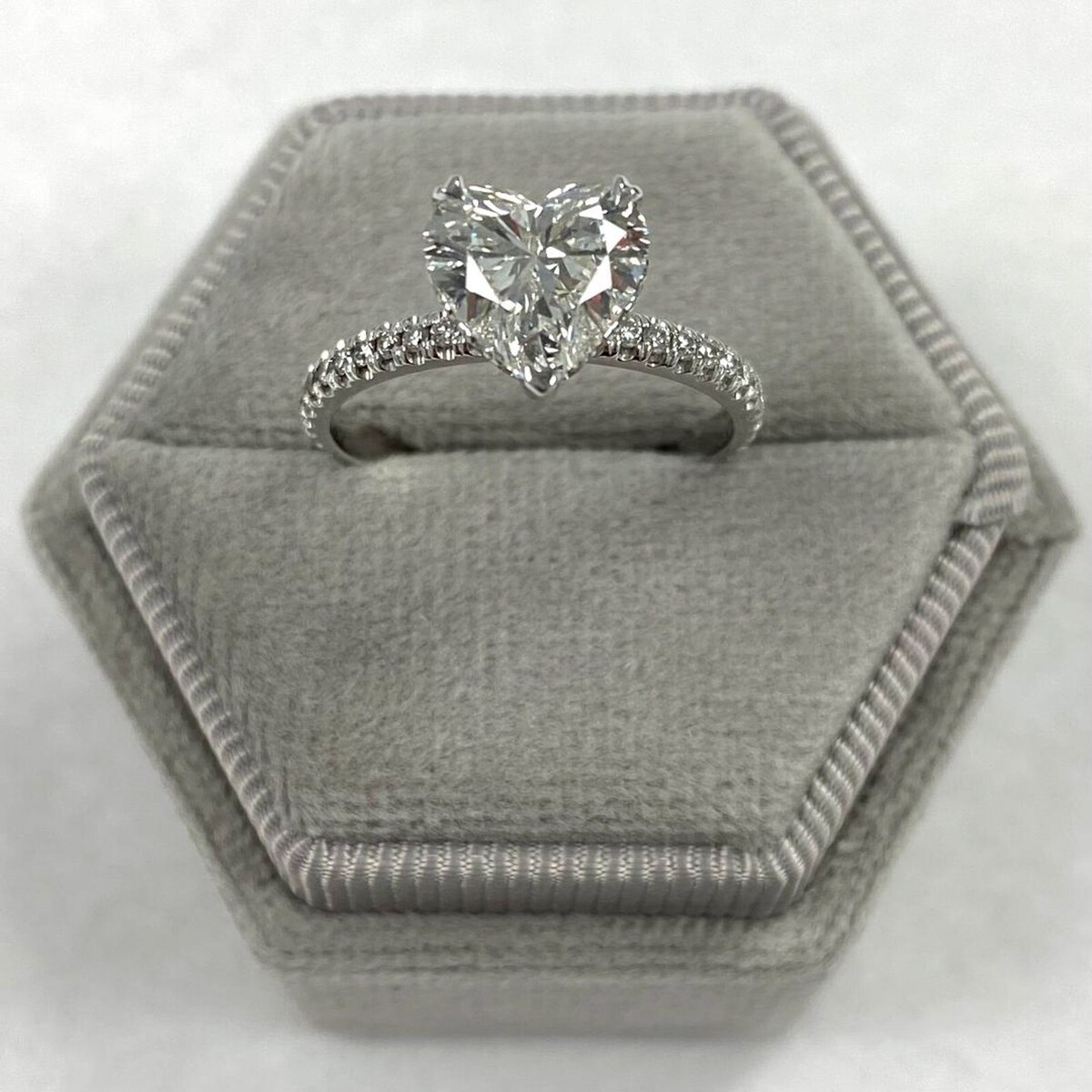 Das 1,59-Karat-Herz-Labor-Labor-Diamant wird fachmannisch geschnitten, um seine Brillanz und sparkle zu maximieren, und sitzt stolz auf einer Gruppe glanzender 14K-Weißgold. Das versteckte Halo-Design umgibt den herzformigen Diamanten mit einer atemberaubenden Reihe von zusatzlichen, brillanten, geschnittenen Labor-Diamanten und fügt noch mehr sparkle und Glanz hinzu.