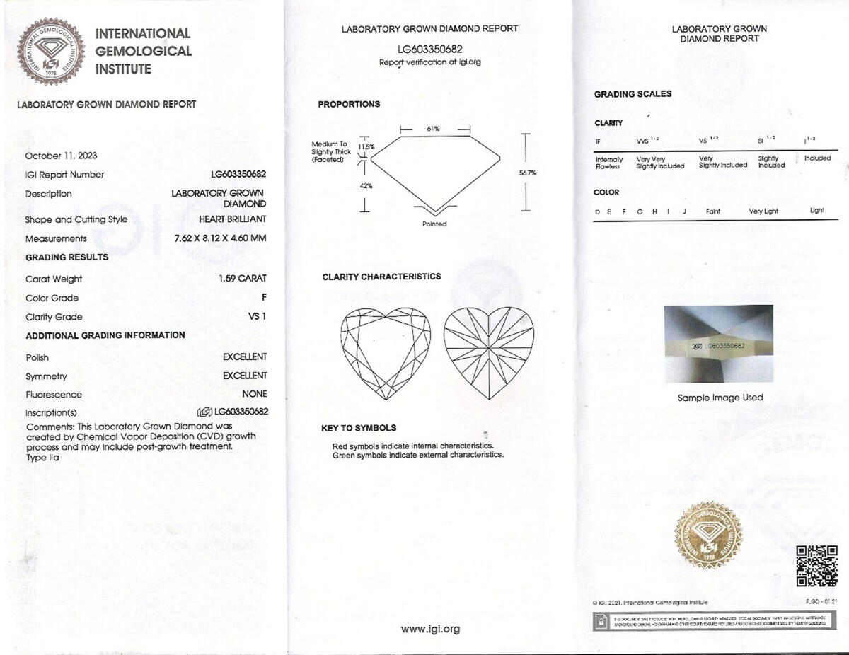 Igi Herz Brillantschliff 1.59 Karat F-VS1 Kunstdiamanten Grown Diamant 2.11 TCW