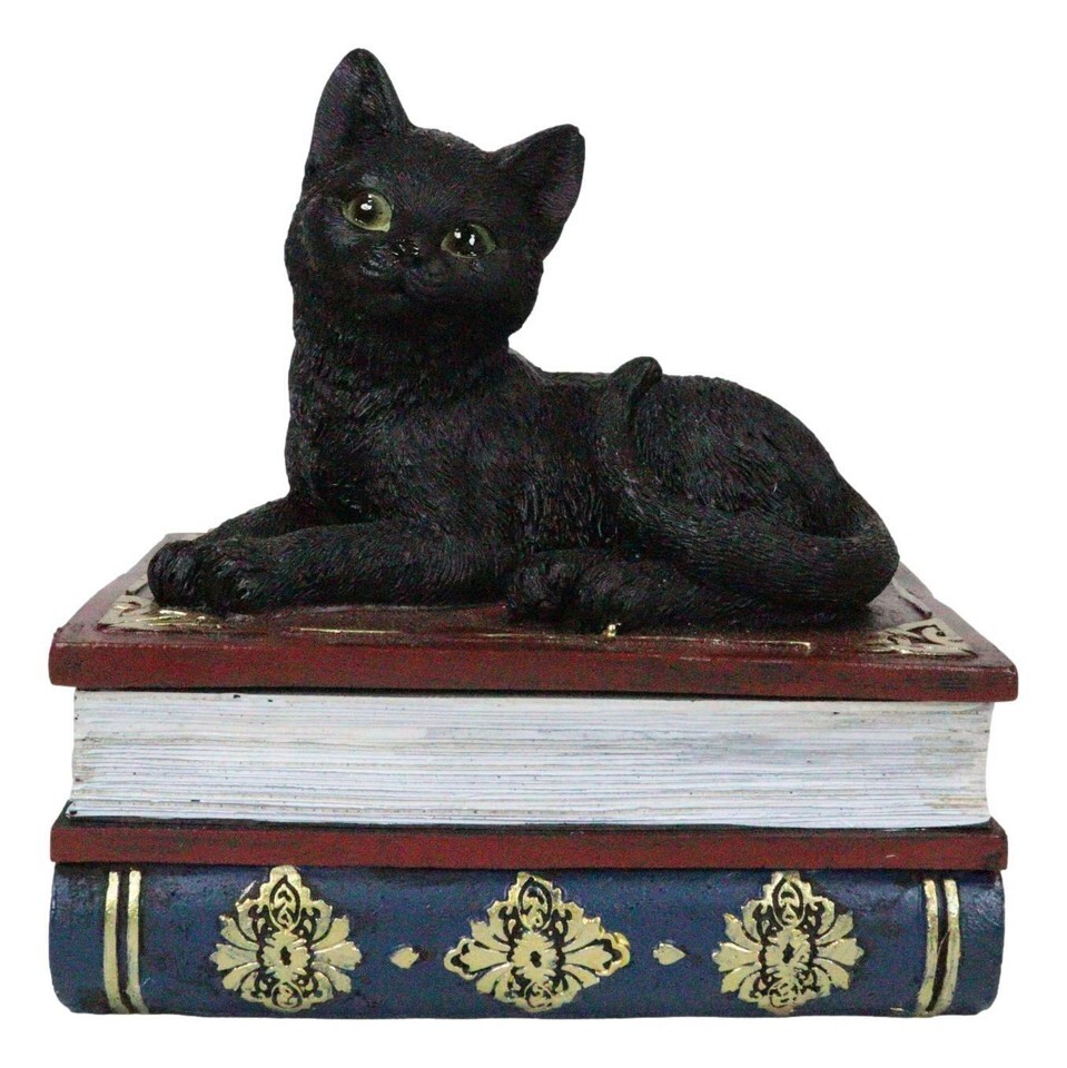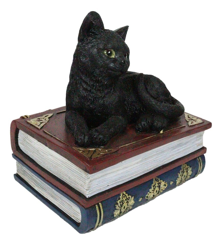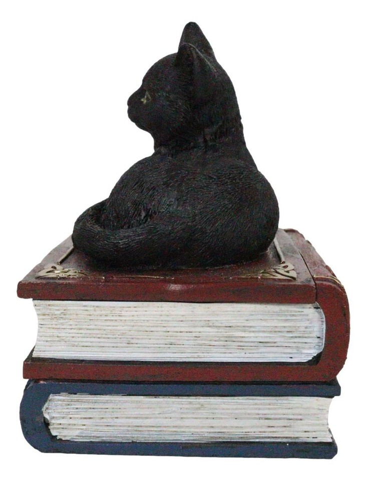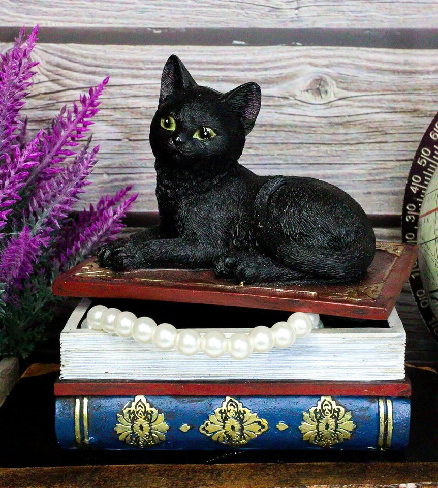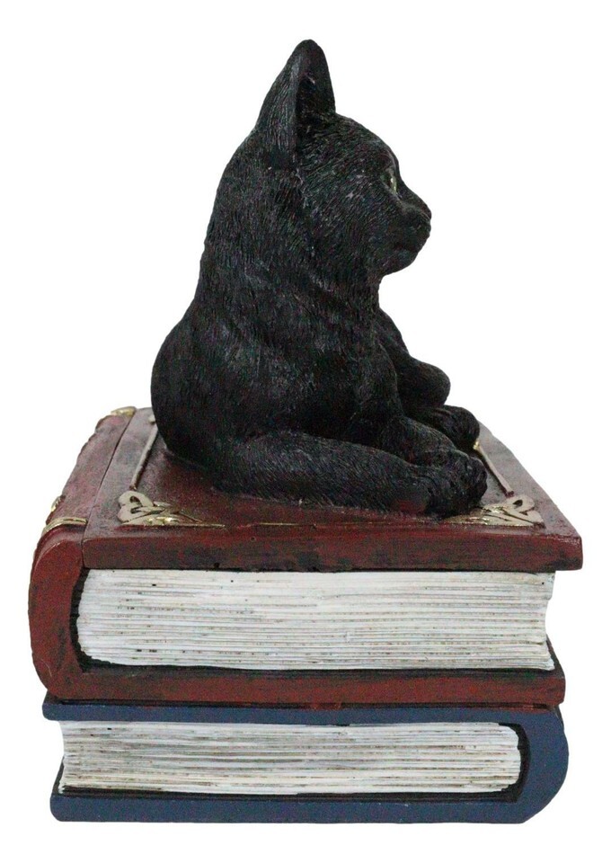 Wicca Mystical Black Cat Sitting On Book Of Spells Stack Decorative Jewelry Box