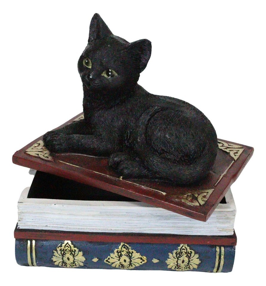 ? A mystical black cat lends its curious all seeing eyes to your domain. Sitting on a book of powerful magical spells, the dark feline silently chants powerful conjuring to bring positive vibes to your household. The box opens completely to reveal a storage space within for you to hide your secret stashes.