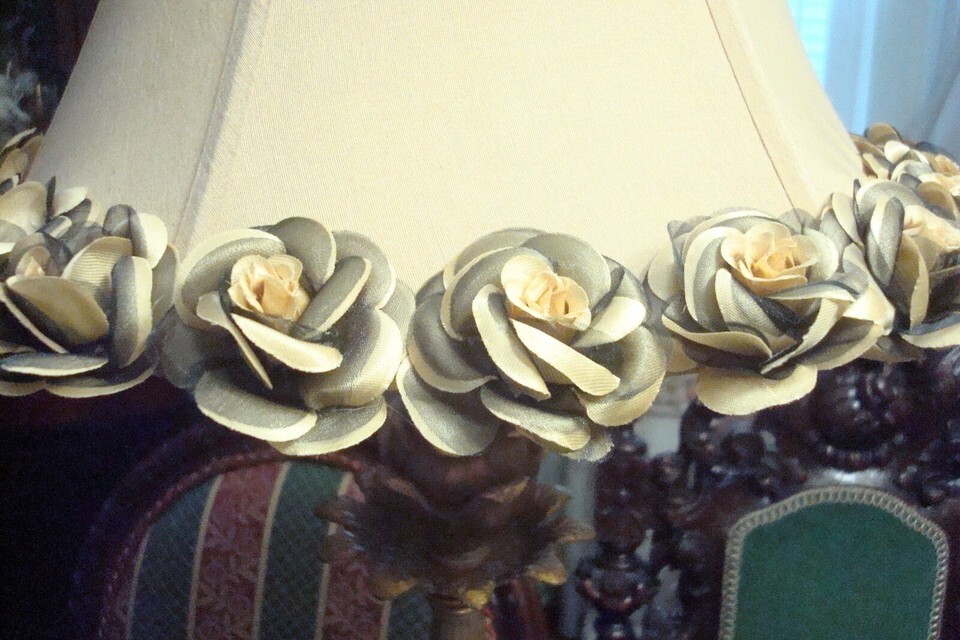 Table lamp metal body, shape of a rose in the body, fluted body, square base, shade decorated with silk roses in beige and green, shade has a small hole, almost invisible, the lamp is new, never used28" to top, 21" to socket, shade is 10" tall by 14" base opening [OUTBACK]