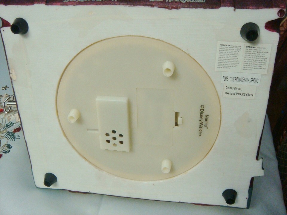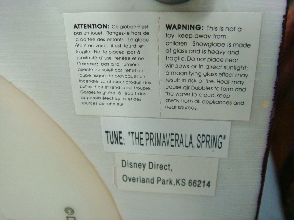 The Chronicles of Narnia Snow Globe by Disney, Musical box, lights and movement. This one does not have the movement that makes the snow fly around, the motor works but it does not make any movement, music and lights are working, no damage, no chips, only the umbrella point of Mr Tumnus is bent, small detail. Beautiful blue lights, It plays "La Primavera" (Spring) 12" tall by 9" by 8" this globe was exposed to too much sunlight, water is a little cloudy, look at the pictures, still gorgeous. I PREFER LOCAL PICK UP ONLY, VERY HEAVY VERY FRAGILE, OR PROFESSIONALLY SEND HTOUGH BUYER OWN UPS / FEDEX ACCOUNT AND PACK BY THEM