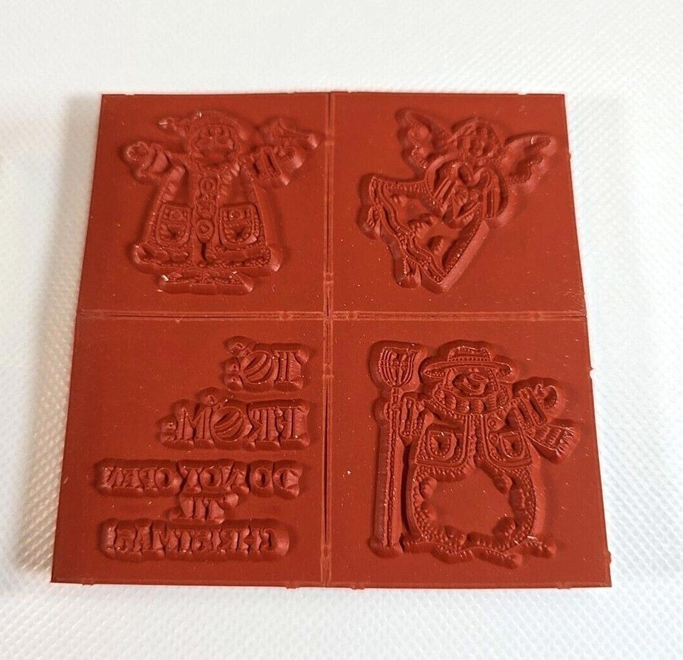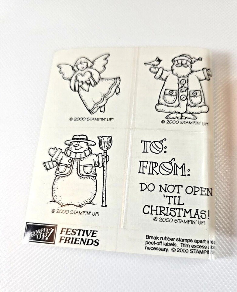 Retired in 2000 and still factory-fresh, this ?Festival Friends? set delivers four whimsical holiday images in never-mounted red rubber. Wood blocks, index stickers, and hard clamshell case are all pristine?ready to stamp crisp Christmas tags, cards, and scrapbook pages for years to come. Comparable new sets routinely move in the $10?12 range, so we?ve priced to sell while leaving room for offers.