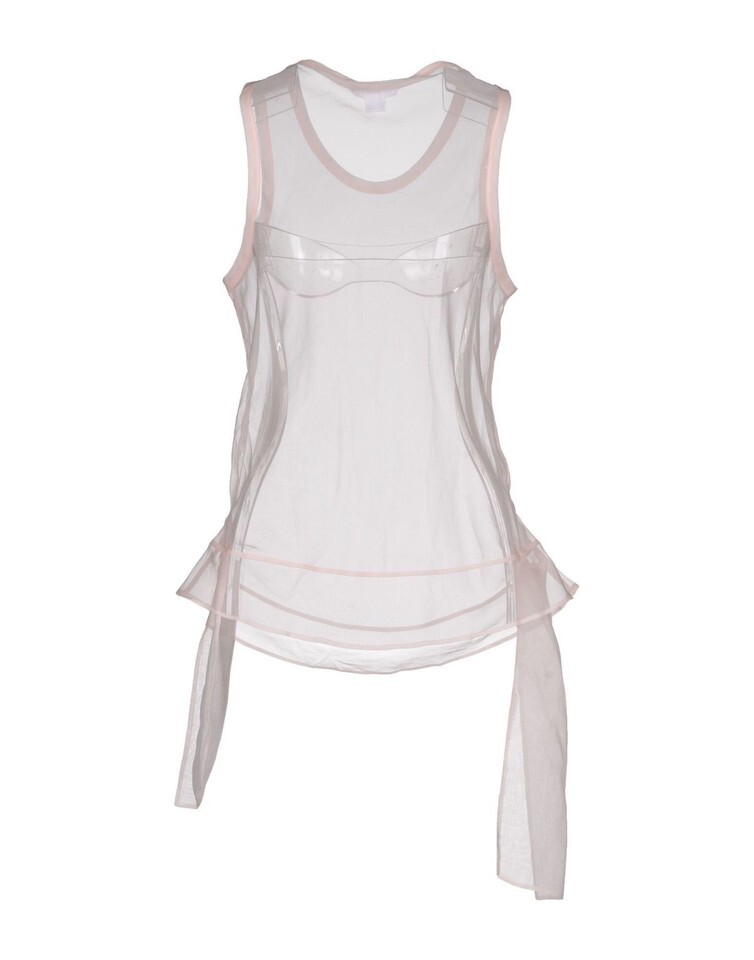 This is a brand new with tags silk tank from the vintage 1999 spring/summer Helmut Lang collection. Sheer pale pink colored silk top with cascading side draping tiers that can be detached. (Note there are not bust seams on the front, this is on the mannequin. Top is solid/smooth except for the double seam on the bottom panel. Also runway photo shows a patterned underlayer under the shirt which is not included. Top is entirely Sheer pink mesh). Size: 44 IT / approx M US