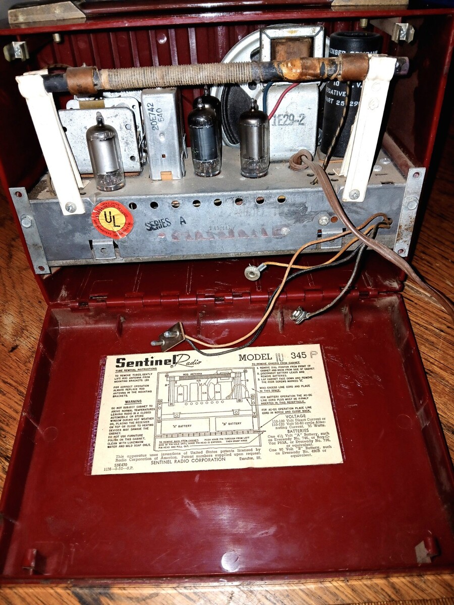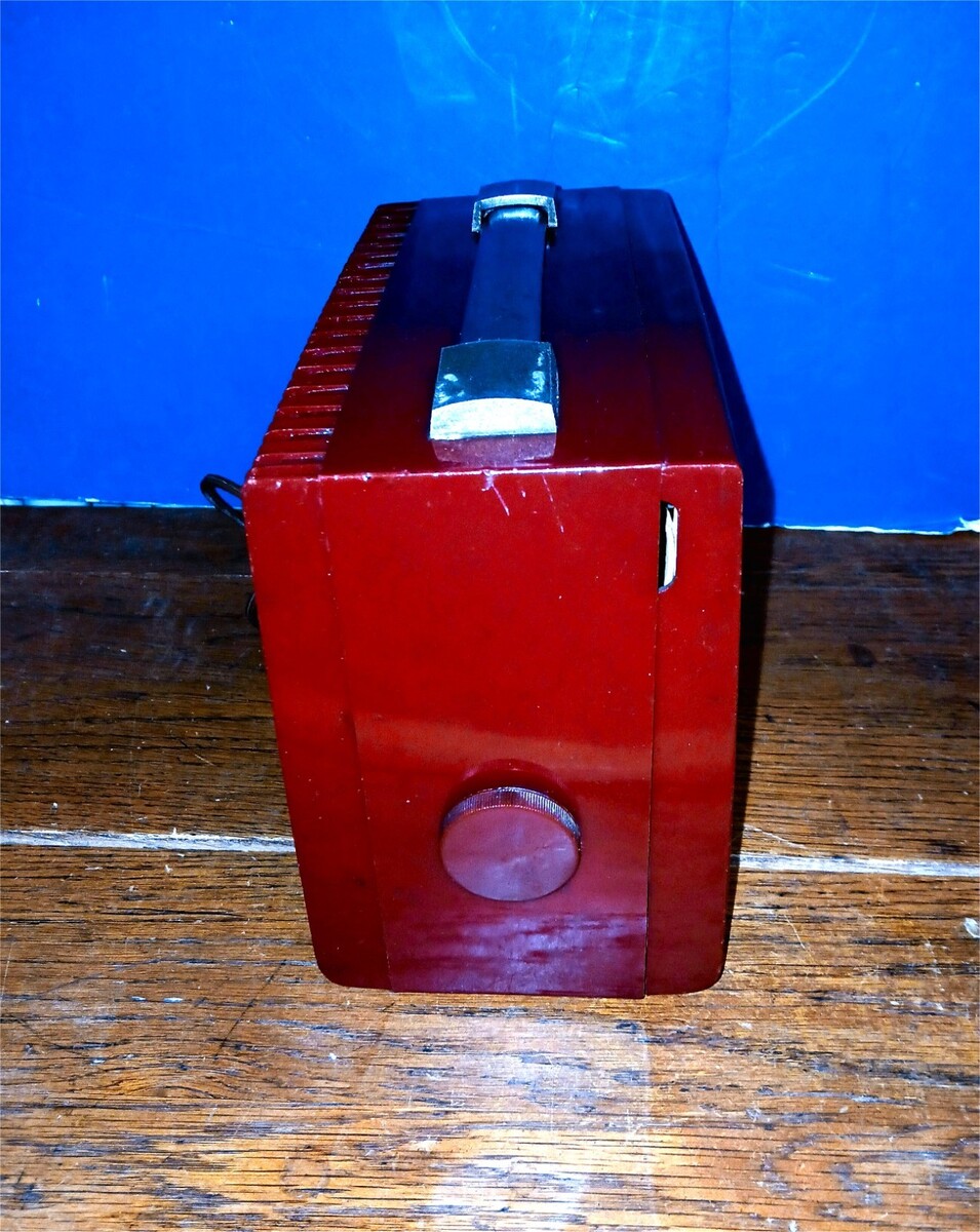 This is a Sentinel Radio Model 345 Series A Vintage 1950s - Red - Bakelite? Body looks in good condition as well as interior. No cracks that I can see. Nice deep red color. I plugged in and turned on but couldn't get any power. I don't know if I needed another battery that connects to the inside wires? Will pack well and ship fast! Sorry, no local pick up