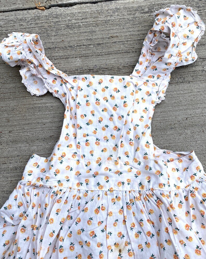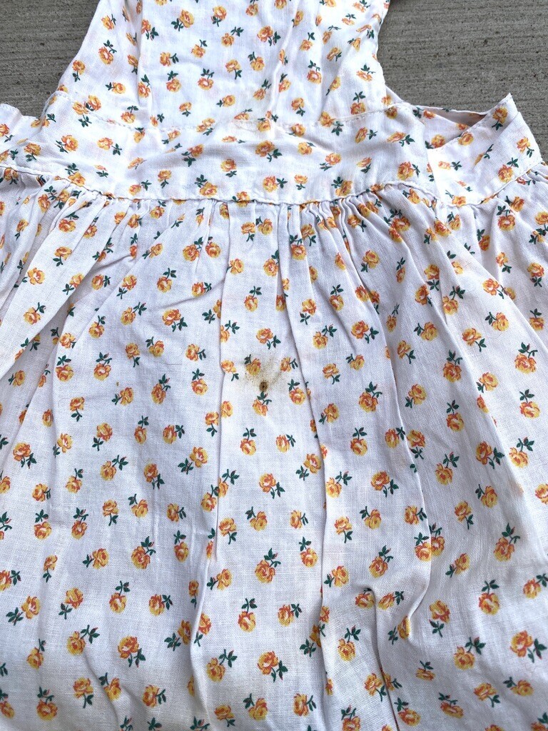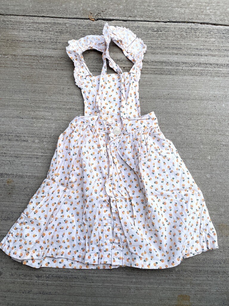 Adorable vintage 1950s baby girl?s pinafore dress, crafted in printed cotton with orange rose motif. Features a full gathered skirt, open chest/bodice design, and waist ties for fit adjustment. Sweet cottagecore aesthetic in miniature form.