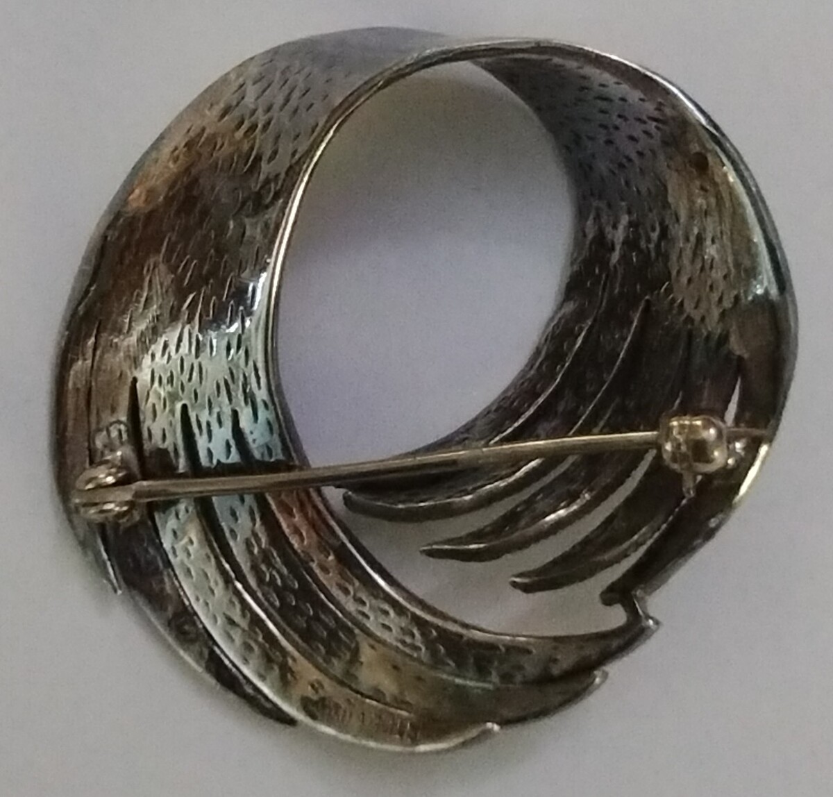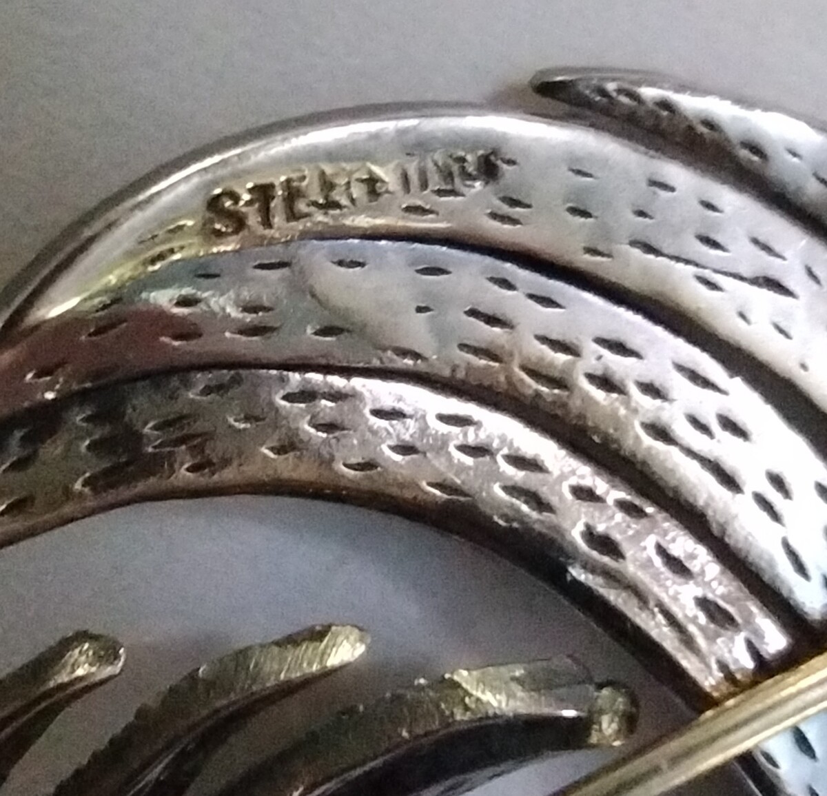 The brooch measures 1.5" in diameter with 1mm marcasite stones lining each feather strand. It has a secure, eorking rollover clasp on the 1.24" pinbar. The total weight is 11.4g.