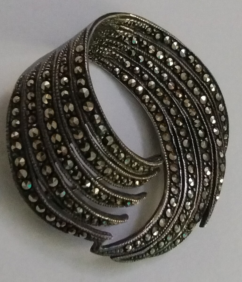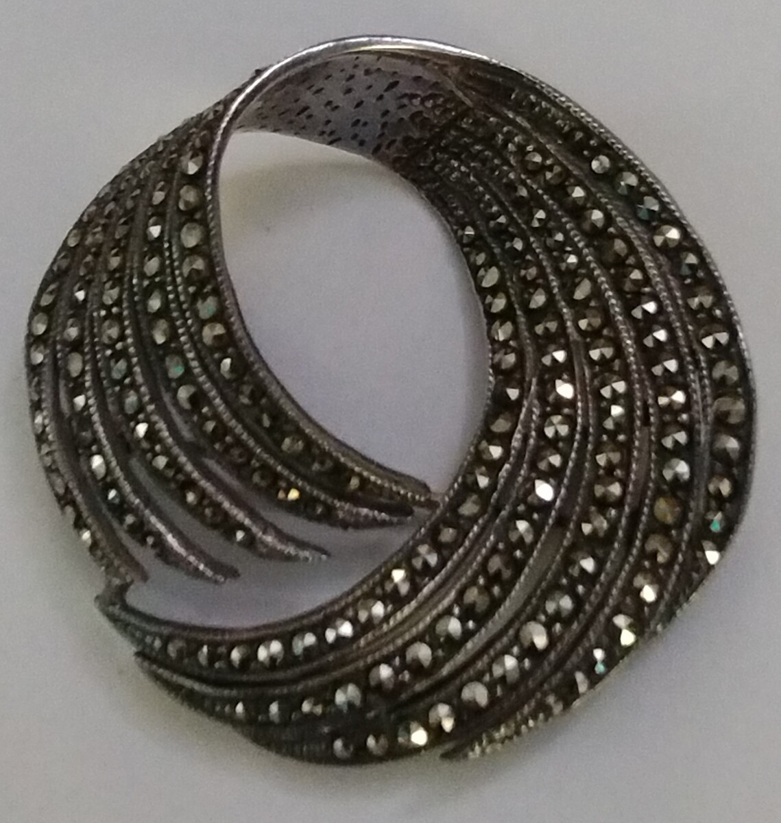 Vintage Feather Swirl Brooch in Sterling Silver embellished with Marcasite stones.