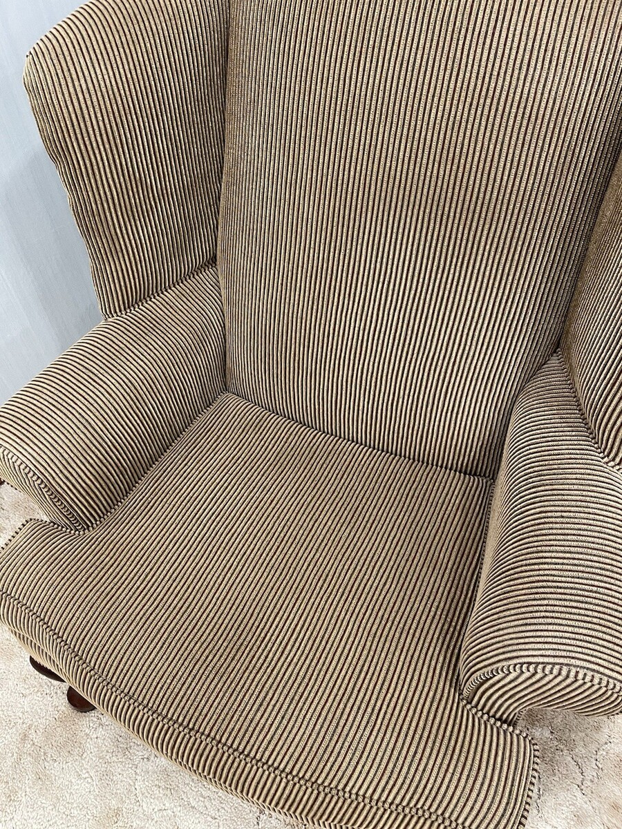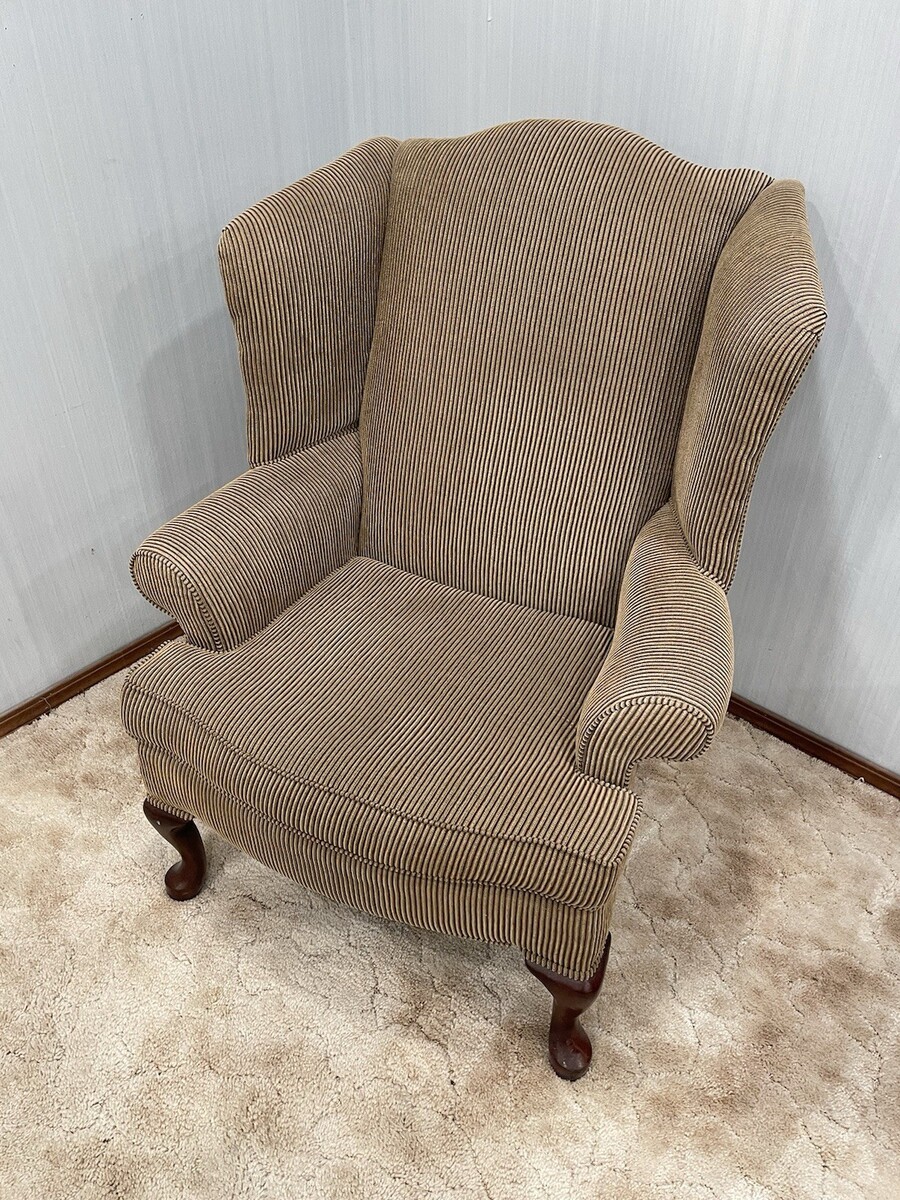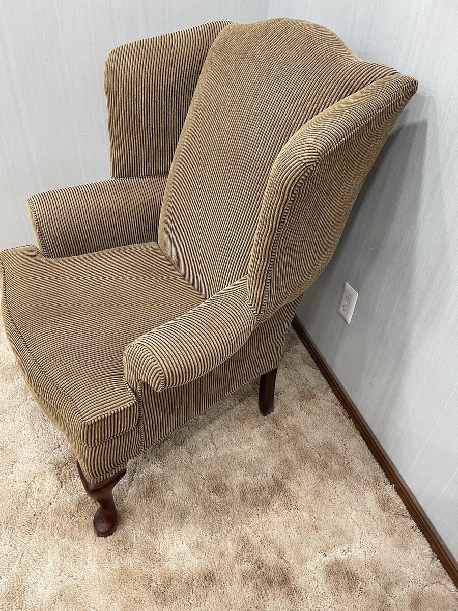 For sale is wood and brown fabric wing back armchair. The chair has very little wear. Very solid and comfortable construction.