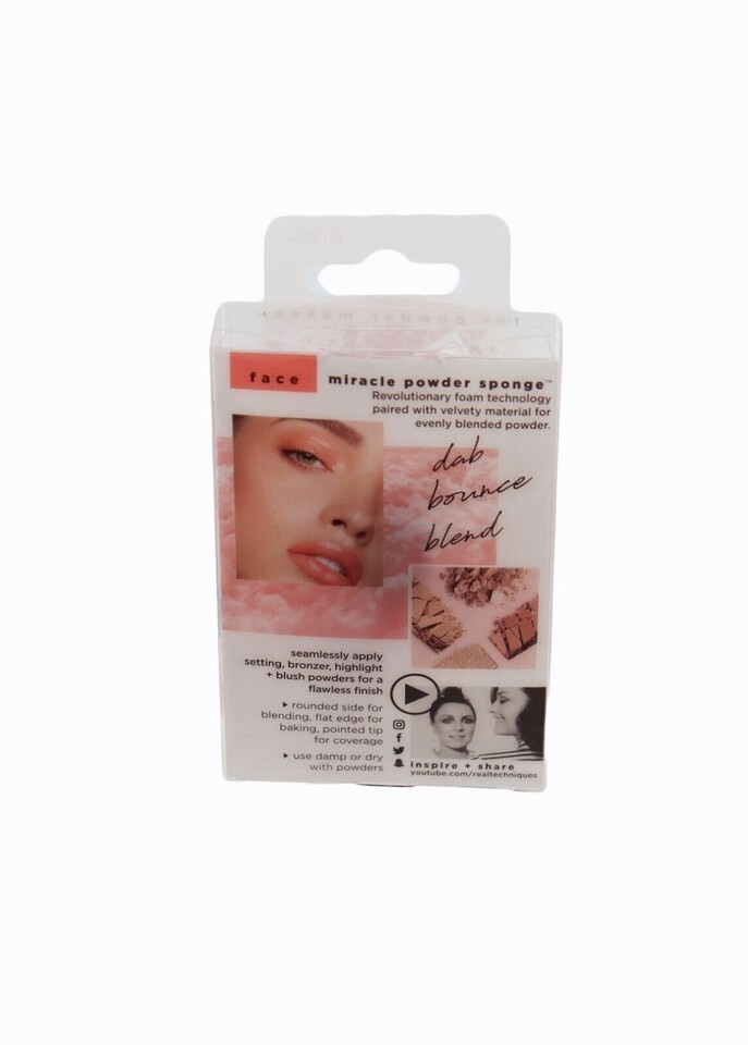 The Miracle Powder Sponge is easy to clean using our Real Techniques Brush + Sponge Cleansing Gel. It's also 100% cruelty-free, vegan, and designed with revolutionary latex-free foam technology. Directions of Use Wet before use and use RT's signature 3-point application technique. Use the flat edge to apply and cover, the round sides to blend and blu