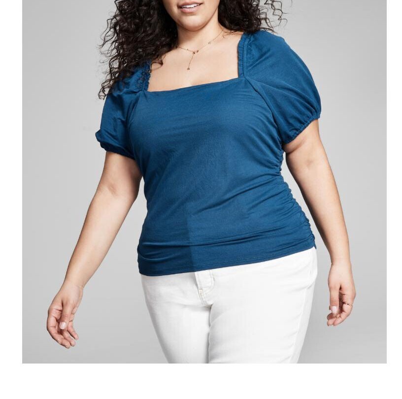 Elevate your wardrobe with this stylish blouse from And Now This. This plus size top features a square neckline and short puff sleeves, giving it a trendy and chic look. The solid blue color and basic style make it versatile and perfect for any occasion.