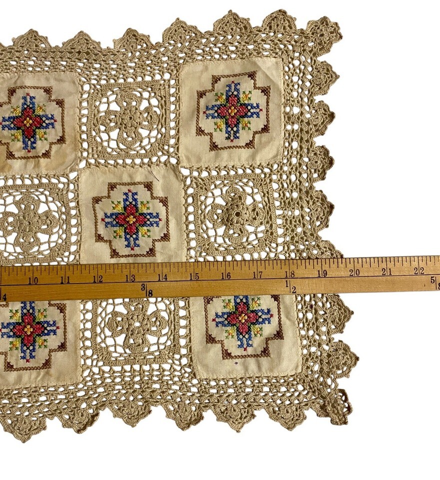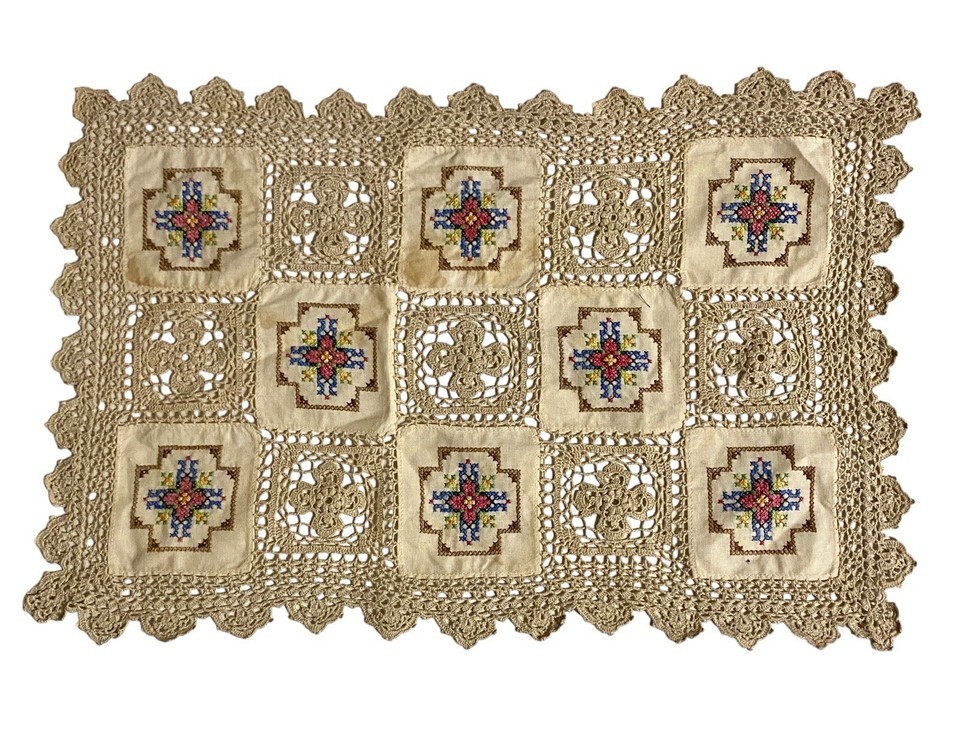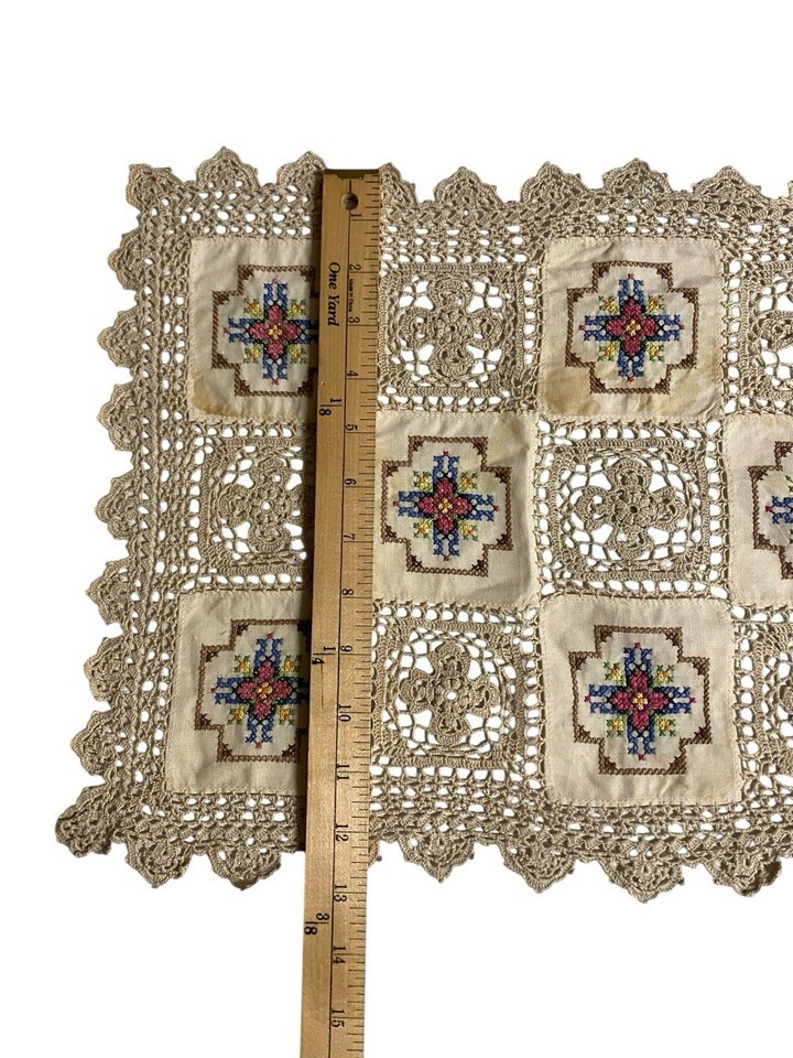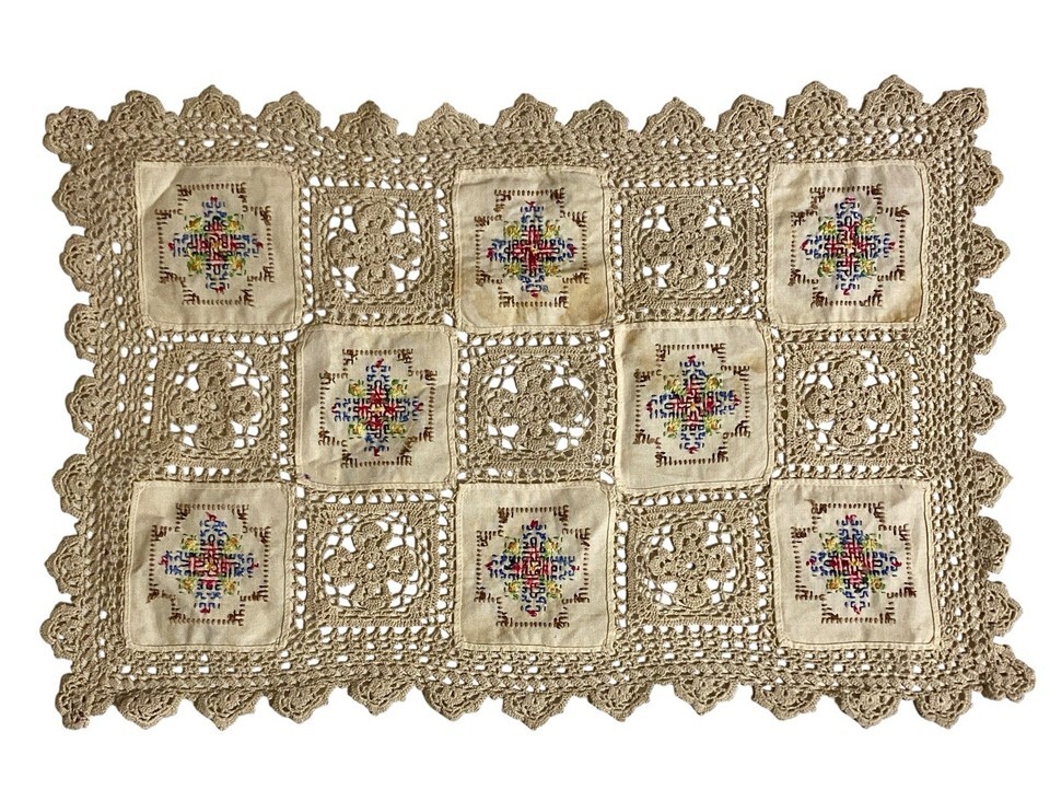 Vintage handmade placemat or dresser scarf. A great deal of care and time went into creating this. Crocheted with fine ecru thread and embroidered with cross stitch design.