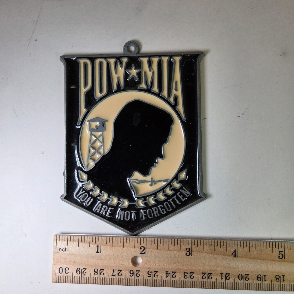 The POW MIA Sun Catcher, measuring approximately 3.25" x 4.25", is a collectible that serves as a reminder of those who have been captured or missing in action. This sun catcher, typically displayed in a sunny window, functions as a small tribute to honor and remember the sacrifices of military personnel. Its retro design and mid-century aesthetic make it a unique and sentimental piece for collectors or veterans' families.