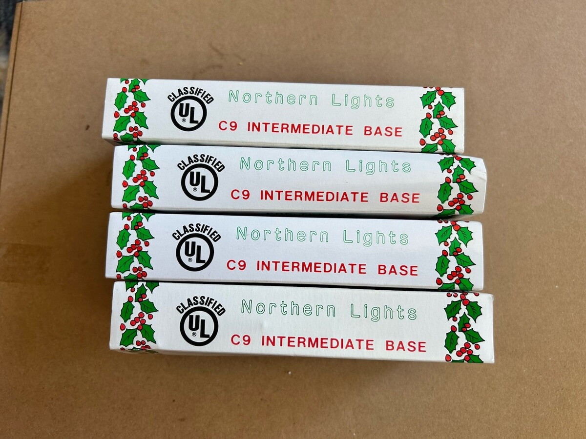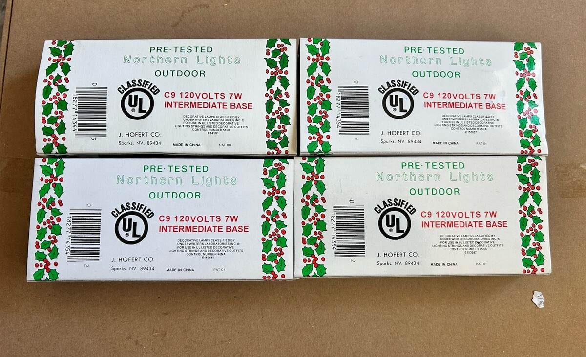 This lot includes 16 vintage Northern Lights blue C-9 replacement bulbs, perfect for decorating your Christmas tree or outdoor space. These glass bulbs are designed for outdoor use and are UL wet listed for safety. With a classic C-9 bulb shape and a blue color, these lights will add a festive touch to your holiday decor. Made by J Hofert Co, these string lights are 120V and ideal for adding a vintage touch to your seasonal lighting display.