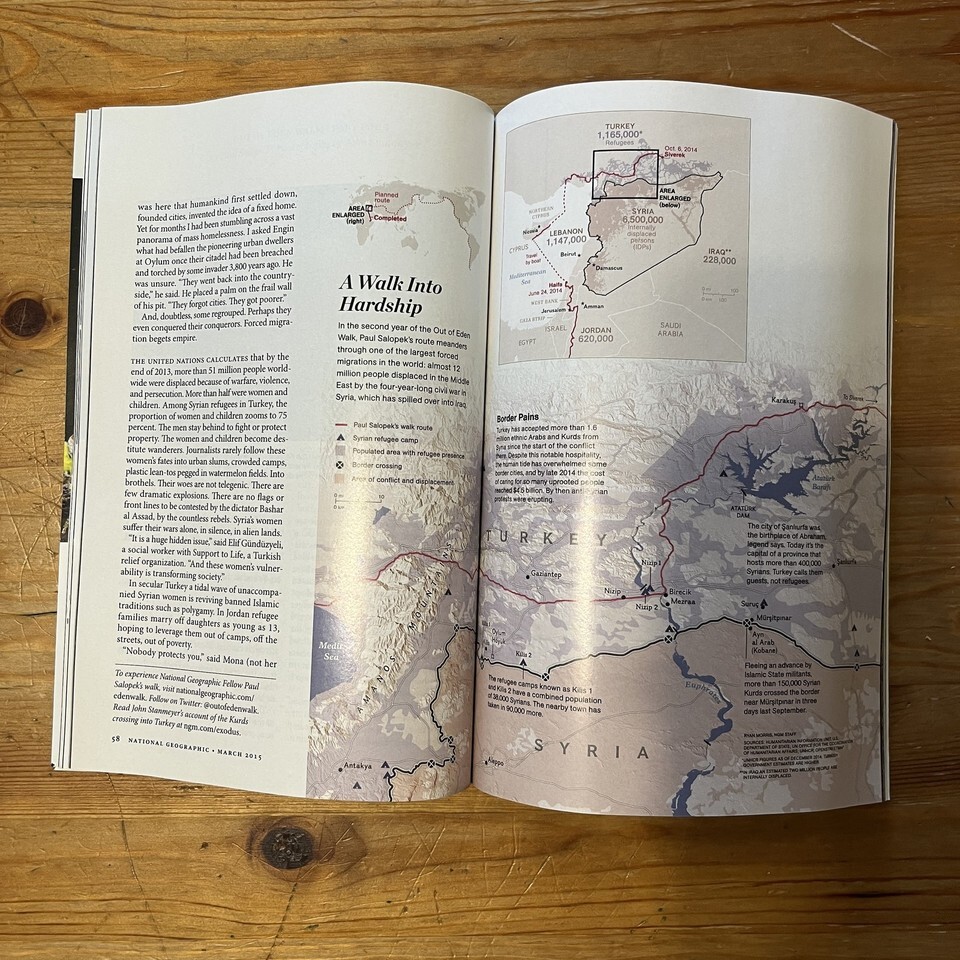 This March 2015 issue of National Geographic features the provocative cover story, 'The War on Science.' At a time of growing public skepticism, this edition tackles prevalent misinformation surrounding topics like climate change, evolution, and the moon landing. The striking cover art, a diorama of the moon landing, encapsulates the theme of questioning established facts. This issue also contains a significant report on the Syrian refugee crisis, offering a poignant look at one of the most critical humanitarian issues of the mid-2010s.
