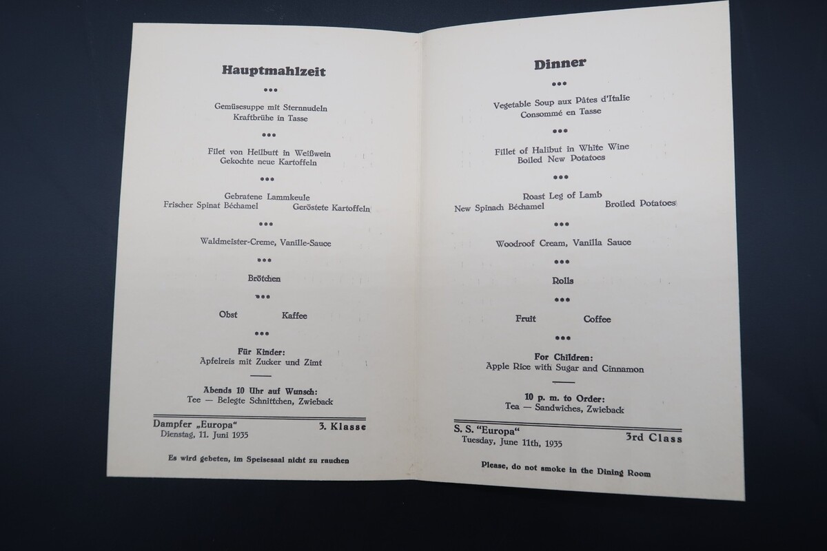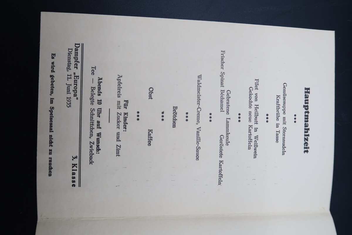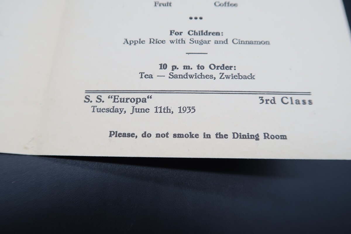 Vtg SS EUROPA North German Lloyd 3rd Class Dinner Menu June 11, 1935 Beautiful
