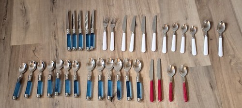 The item for sale is a vintage Sears Stainless USA Misty Isle Flatware Mixed Lot of 11 Pieces. 5 teaspoons, 1 dinner fork, 2 knives, and 3 tablespoons. In good used condition with minor age-related wear.