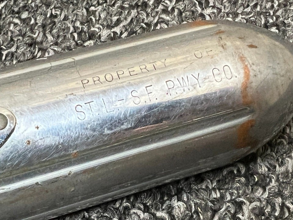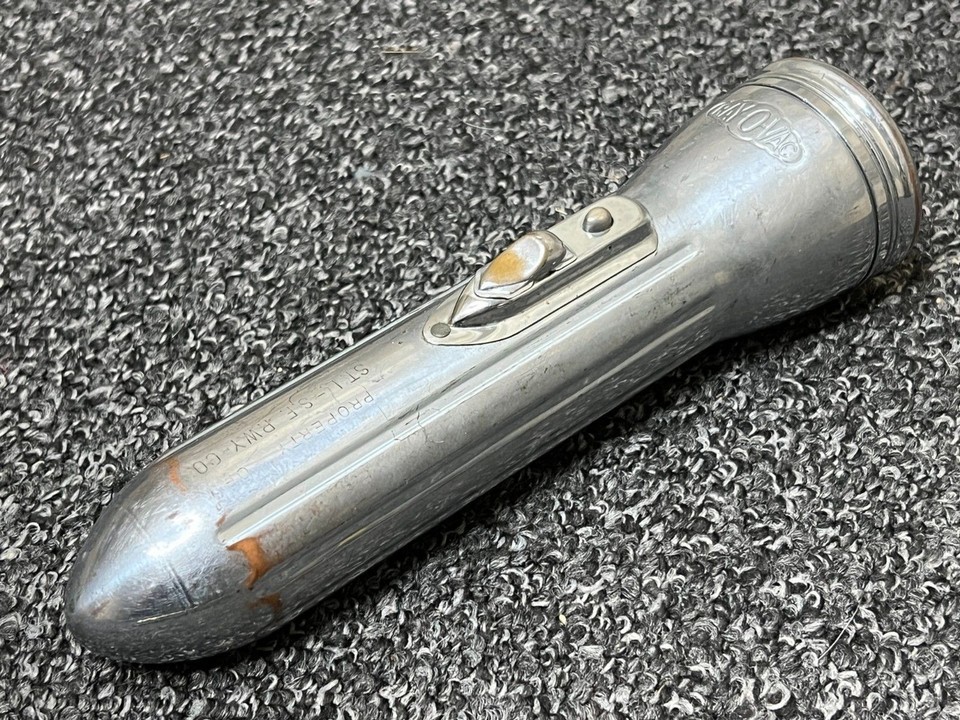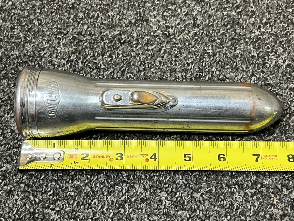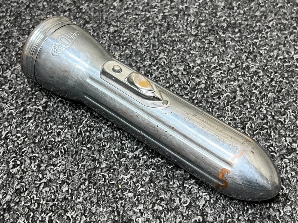 The item for sale is a vintage Ray-O-Vac 7.5" Bullet Torpedo Style Chromed Metal Flashlight, Made in USA. In working condition with age-related wear and some light rusting. Has Property of ST. L.-S.F. RWY CO. engraved into the body of the flashlight.