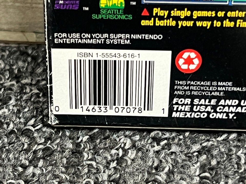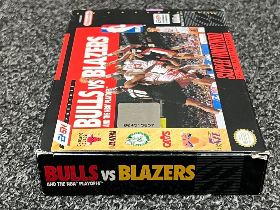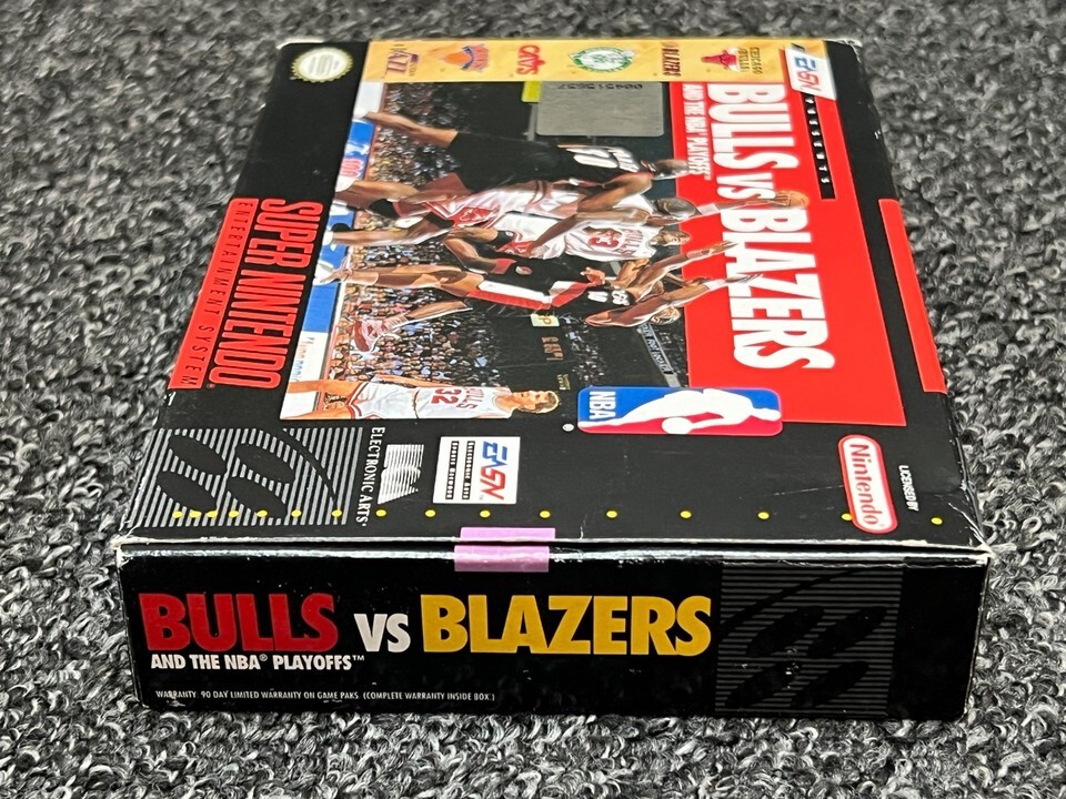 The item for sale is a vintage SNES Bulls vs. Blazers and the NBA Playoffs (Super Nintendo, 1992) CIB Authentic SNES. The box shows some minor age-related wear. The cartridge looks brand new. Not sure it was ever played.