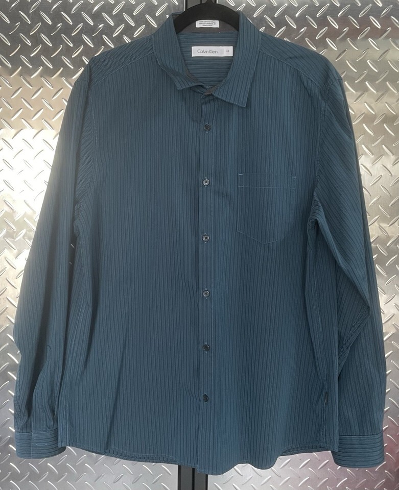 Classic Calvin Klein Men?s Easy Shirt in dark green with subtle vertical striping. Long sleeve cotton button-down perfect for office wear, business casual, or elevated everyday styling. Comfortable and versatile layering piece.