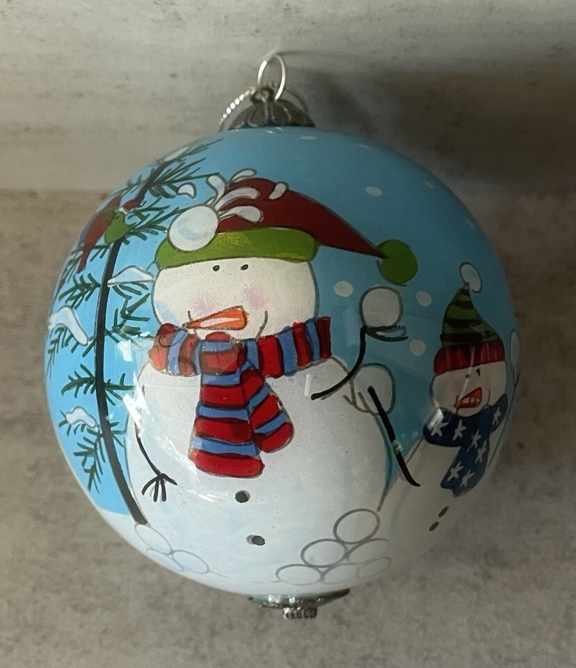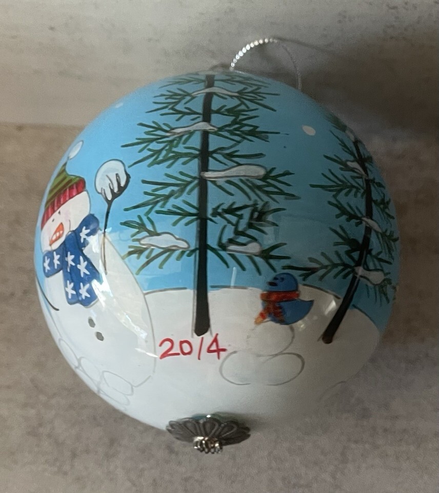 Beautiful Li Bien Pier 1 Imports hand-painted glass ornament dated 2014, featuring Snowmen in winter scene. Art is painted from the inside of the glass using the reverse painting technique.