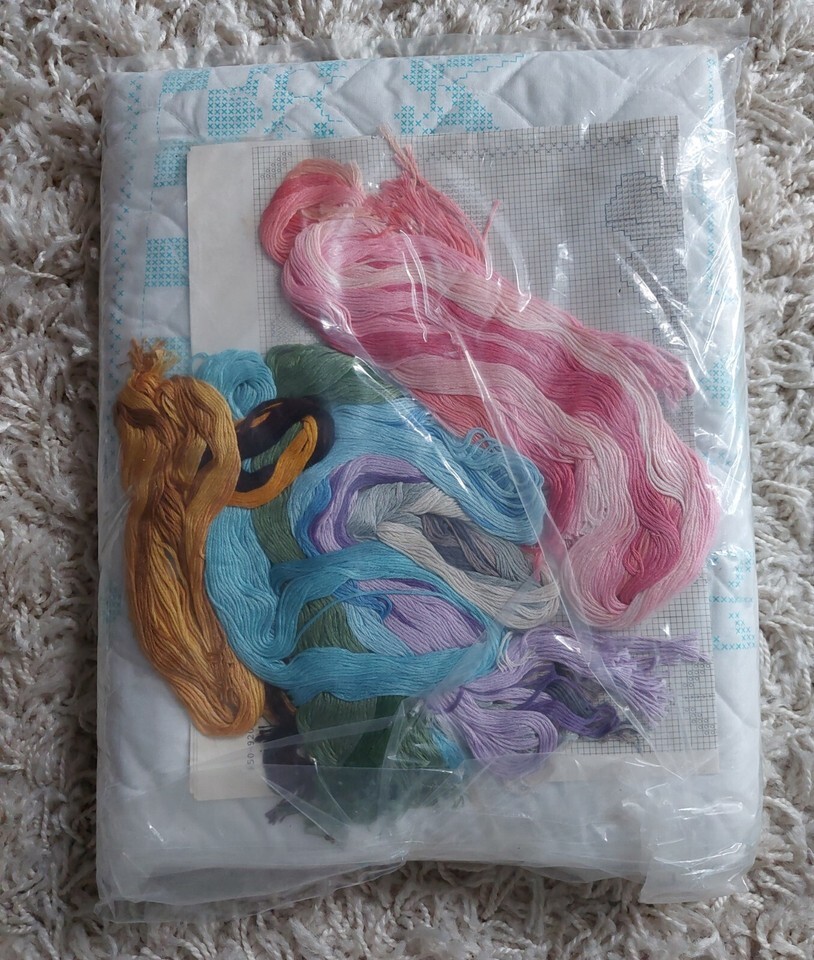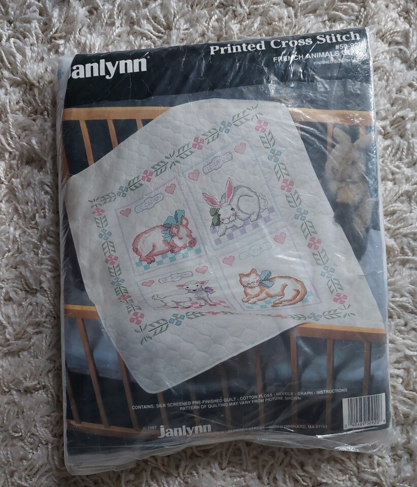 This is a vintage (1987) but new, stamped baby quilt for cross-stitch kit featuring an array of French Farm Animals from Janlynn. The finished quilt measures 34? by 43? and is pre-quilted. Contents include the quilt, 100% Cotton embroidery floss, graph, and complete instructions. We are a smoke-free home.