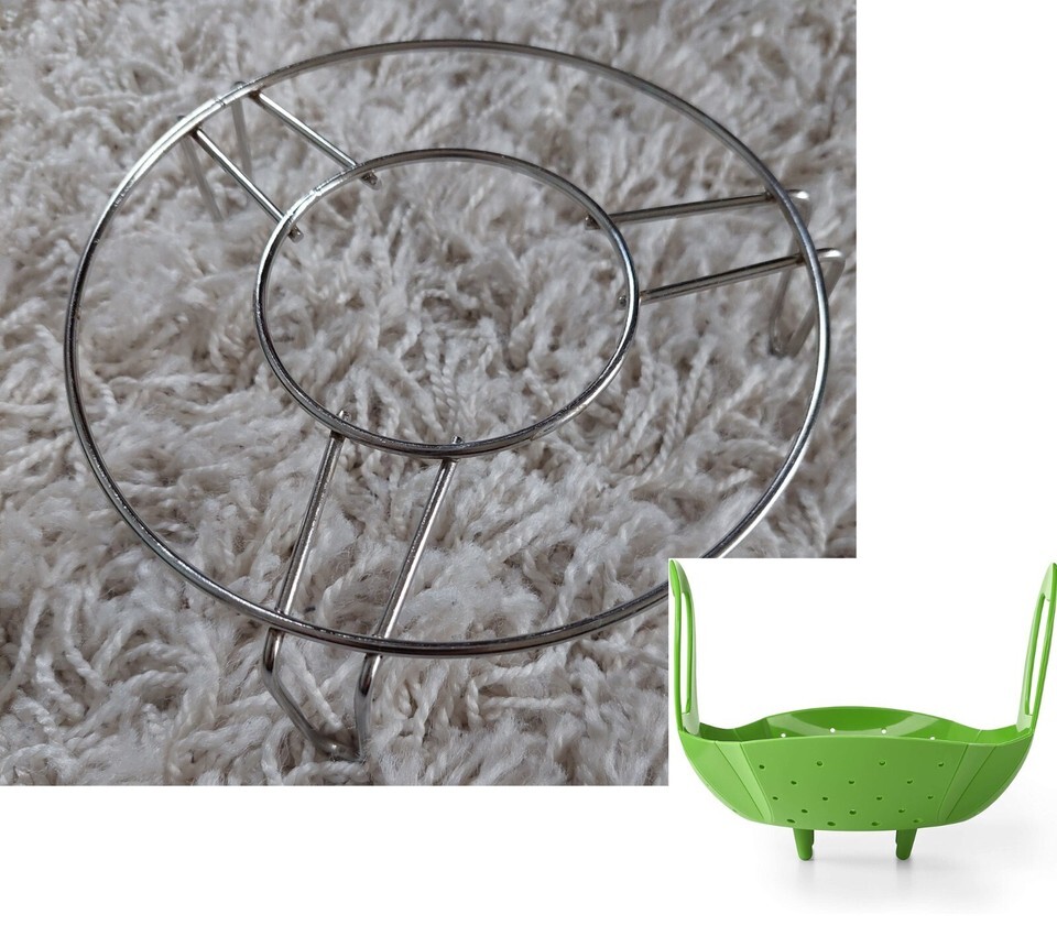 1. A stainless steel rack for an instant pot that can also be used as a canning rack. It measures 6.5? across and 2 OE? in height.